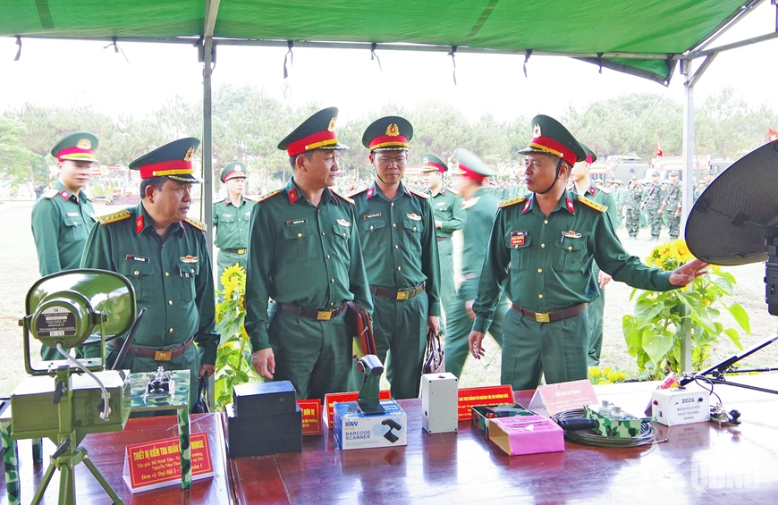 Các đại biểu dự lễ ra quân huấn luyện tham quan mô hình học cụ, đồ dùng huấn luyện của Trung đoàn Thông tin 29.