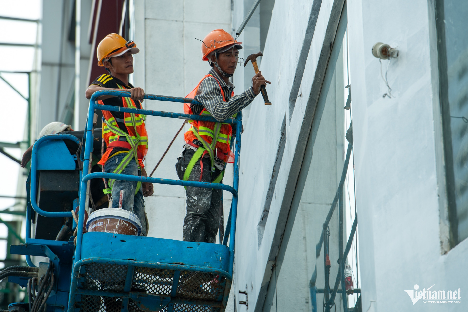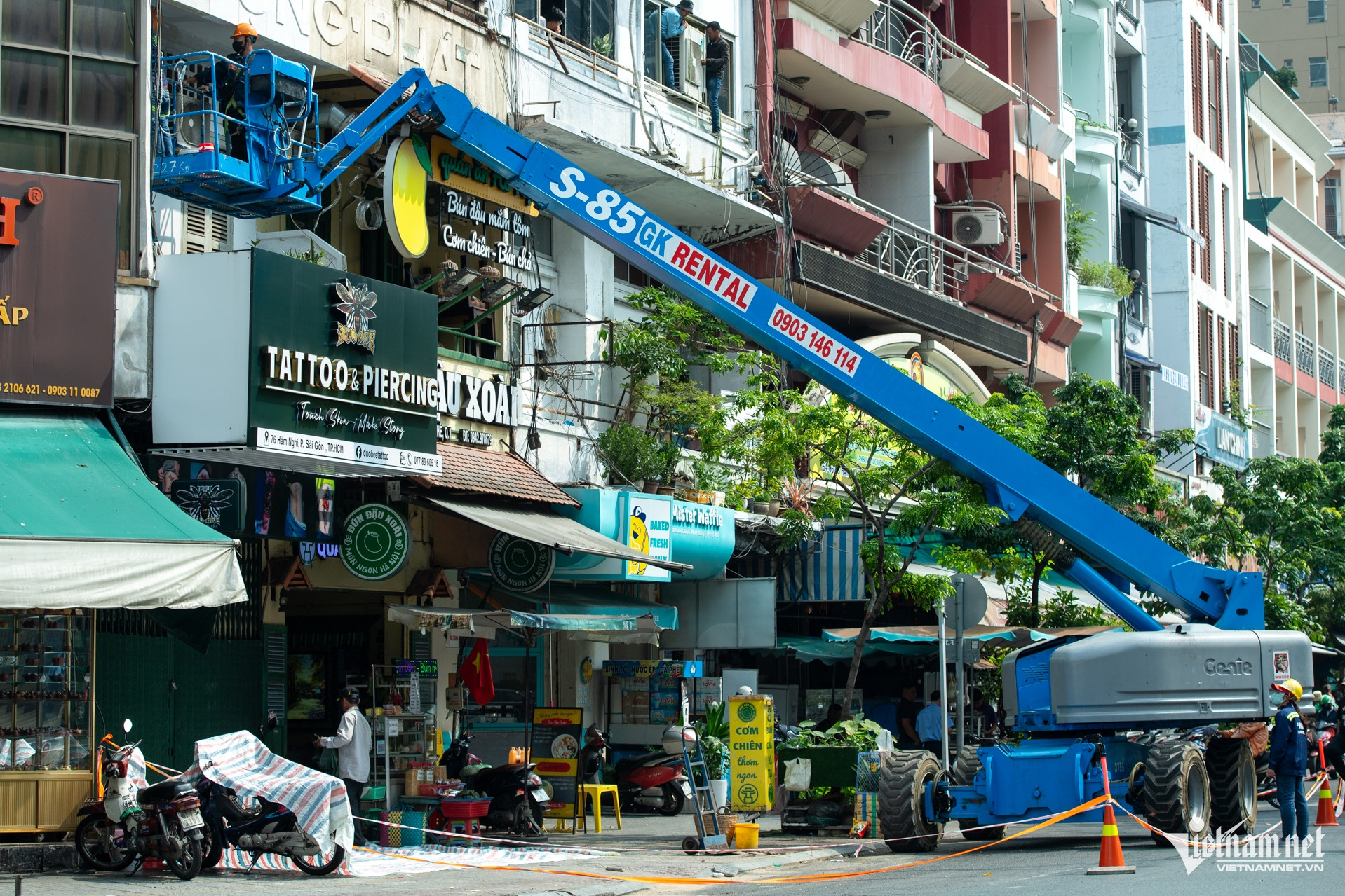 Trên đường Hàm Nghi, ngày 20/1, xe nâng đã được triển khai tại các chung cư để sơn sửa, làm sạch mặt tường.