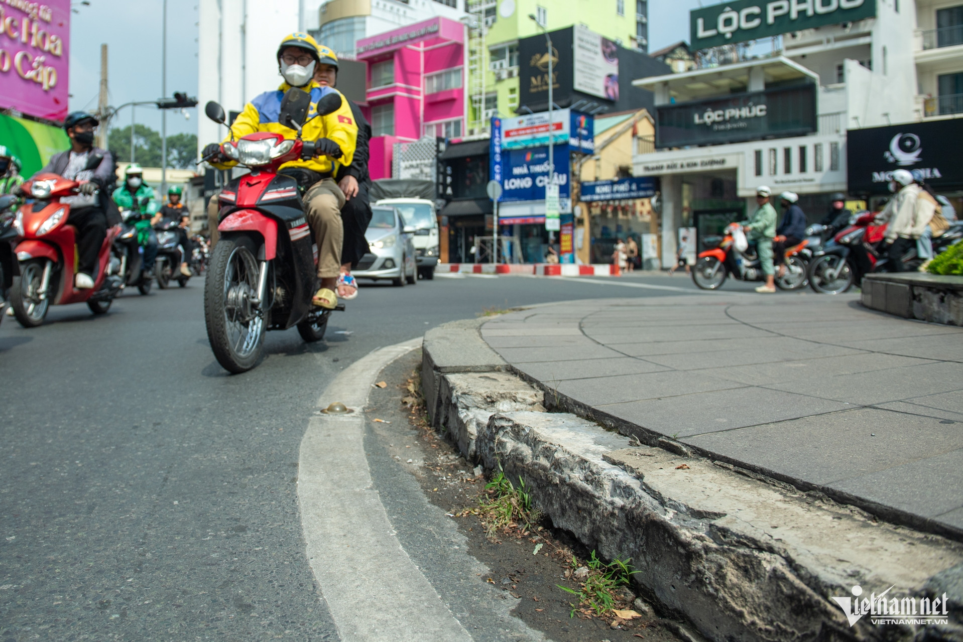 Một mảng đá lát bị bong tróc tại khu vực vòng xoay ngã sáu Phù Đổng.