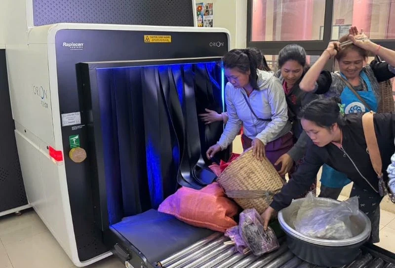 Hành khách nhập cảnh nhận lại hành lý, hàng hóa sau khi được kiểm tra bằng máy soi chiếu hiện đại khi qua Cửa khẩu quốc tế Na Mèo.