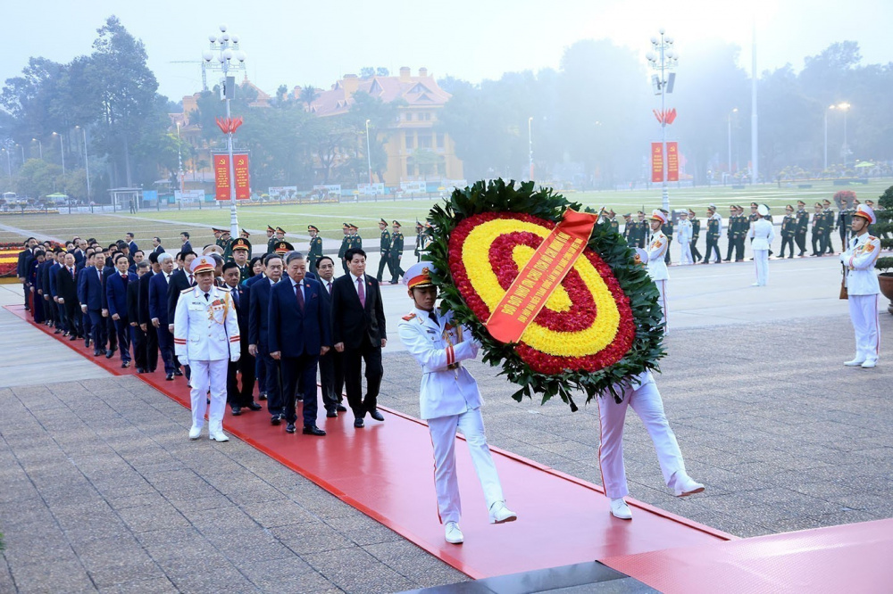 Đoàn đại biểu lãnh đạo Đảng, Nhà nước do Tổng Bí thư Tô Lâm dẫn đầu đến đặt vòng hoa tại Đài tưởng niệm các Anh hùng liệt sĩ trên đường Bắc Sơn (Ba Đình, Hà Nội). Ảnh: TTXVN