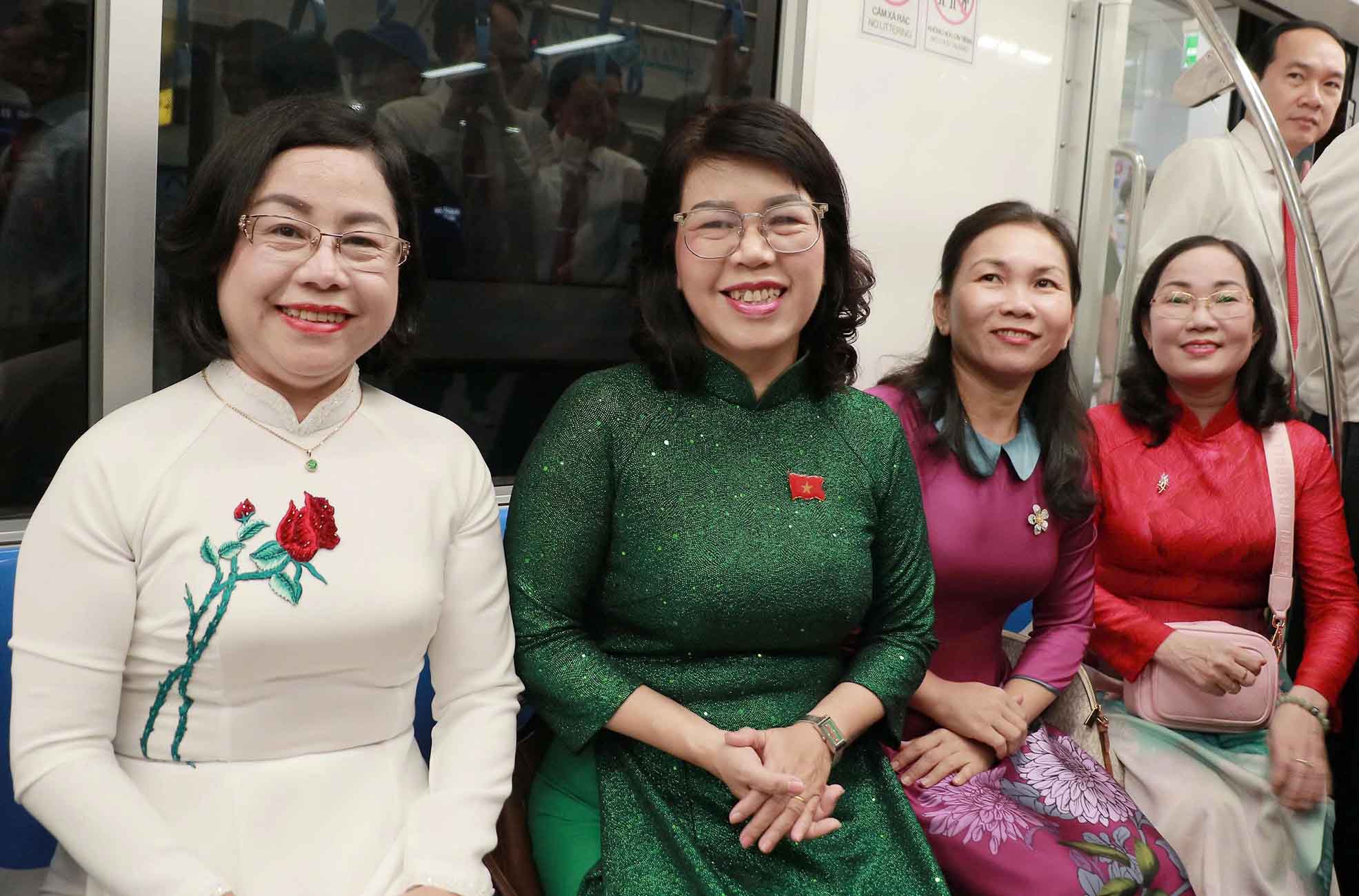 Bà Trương Lê Mỹ Ngọc, Bí thư Đảng ủy phường Tân Sơn Hòa (áo xanh) cùng các đại biểu trải nghiệm tuyến Metro số 1. Ảnh: Trọng Tín.