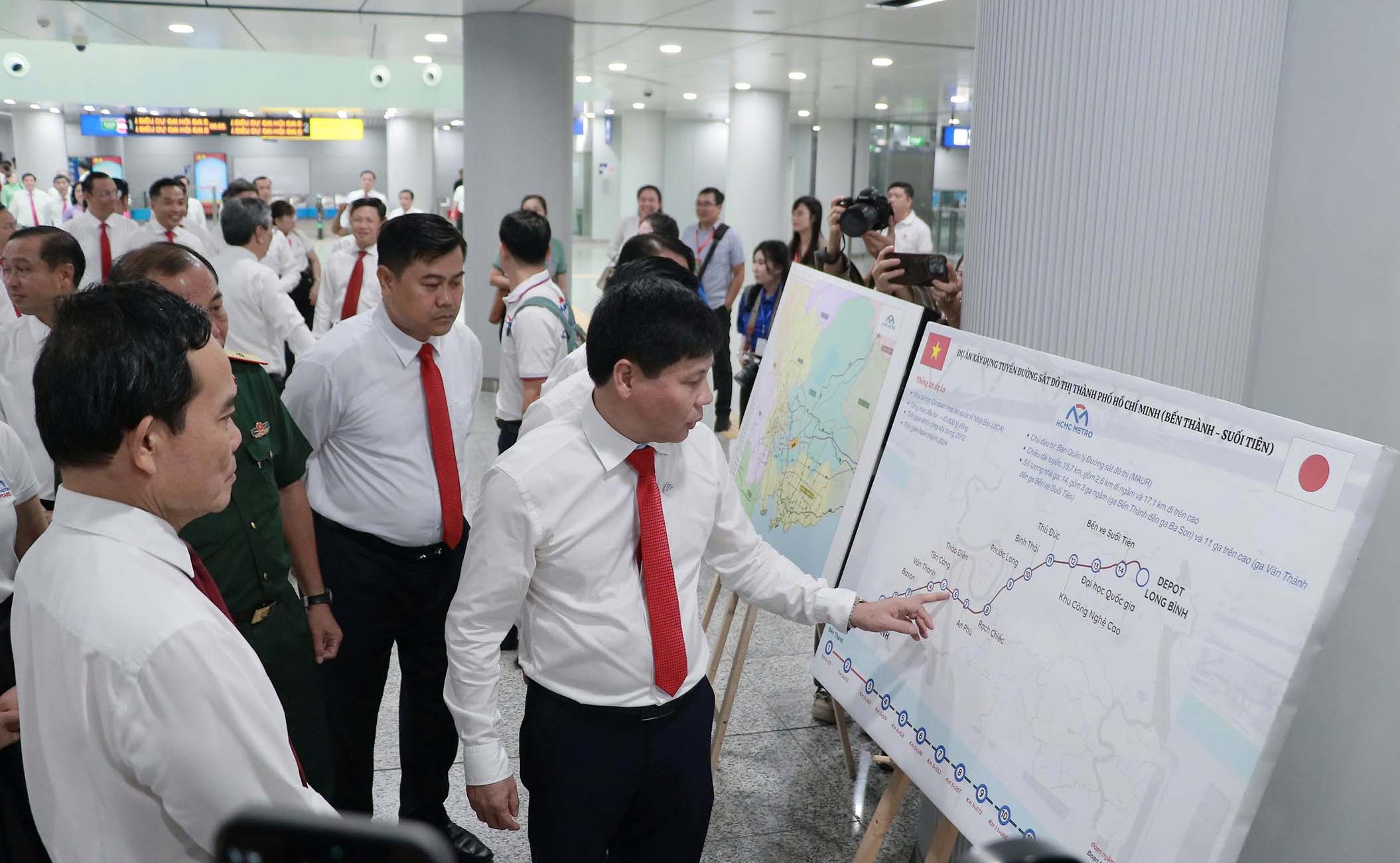Đoàn đại biểu dự Đại hội Đảng bộ TP.HCM nhiệm kỳ 2025 - 2030 tham quan, trải nghiệm tuyến Metro số 1. Ảnh: Trọng Tín.