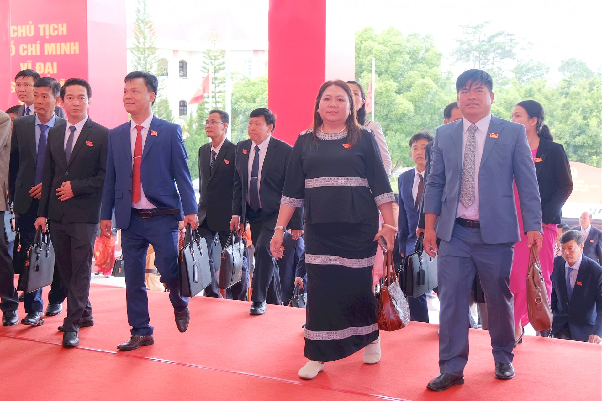 Đại biểu người dân tộc thiểu số tiến vào khu vực Hội trường, nơi diễn ra Phiên trù bị Đại hội Đảng bộ tỉnh Lâm Đồng lần thứ I, nhiệm kỳ 2025 - 2030