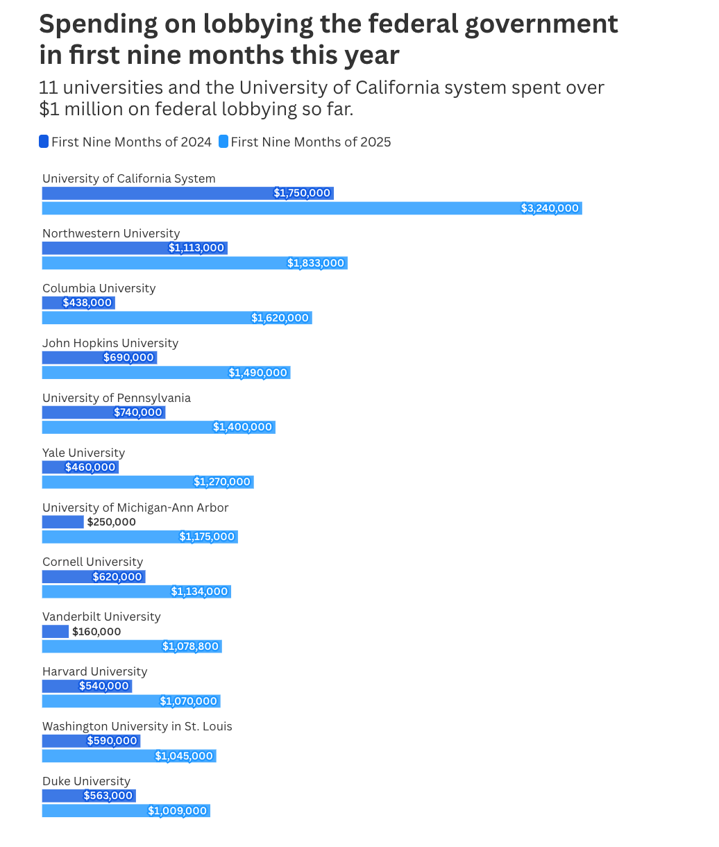 Trong nỗ lực gia tăng ảnh hưởng, các trường đại học Mỹ ngày càng dựa vào các công ty vận động hành lang chuyên nghiệp thay vì chỉ sử dụng nhân sự nội bộ. Theo dữ liệu liên bang, mức chi cho các hãng bên ngoài cao gấp tám lần so với năm ngoái.