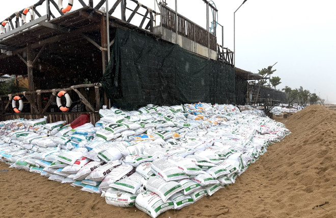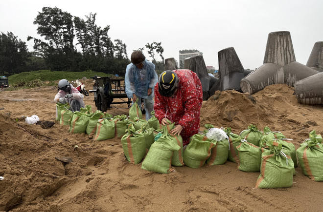 Người dân phường Tuy Hòa khẩn trương làm bao cát chèn chống nhà cửa. (Ảnh: Tường Quân/TTXVN)