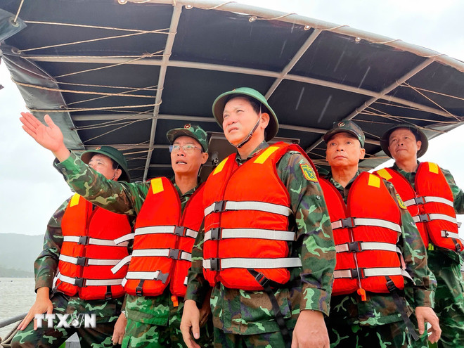 Trung tướng Lê Ngọc Hải - Tư lệnh Quân khu V kiểm tra công tác ứng phó bão tại cảng cá Quy Nhơn. (Ảnh: TTXVN phát)