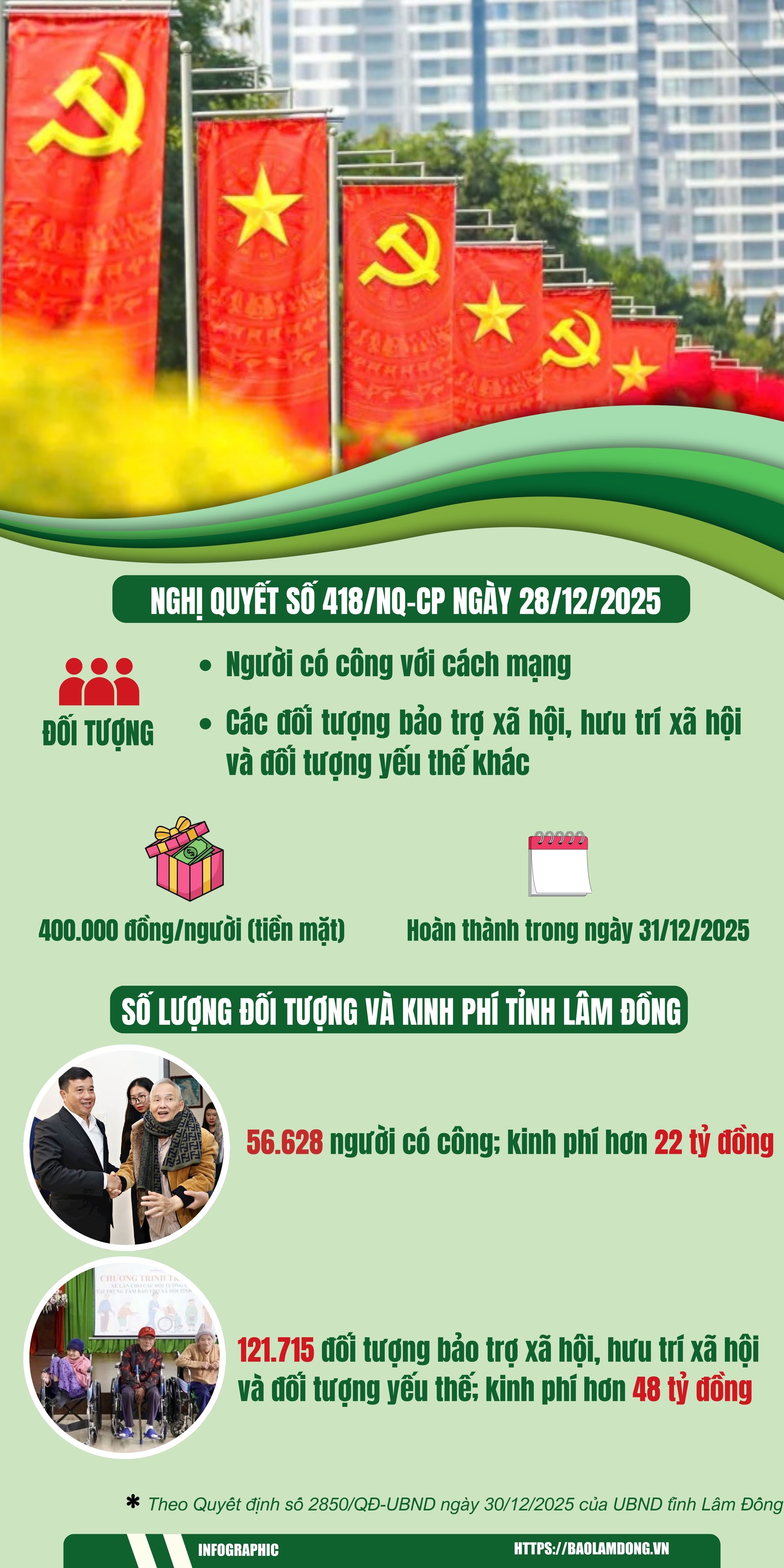 Ngày 30/12, UBND tỉnh Lâm Đồng đã ban hành Quyết định 2850 về việc bổ sung có mục tiêu cho các xã, phường, đặc khu kinh phí để thực hiện chi trả quà theo Nghị quyết số 418.