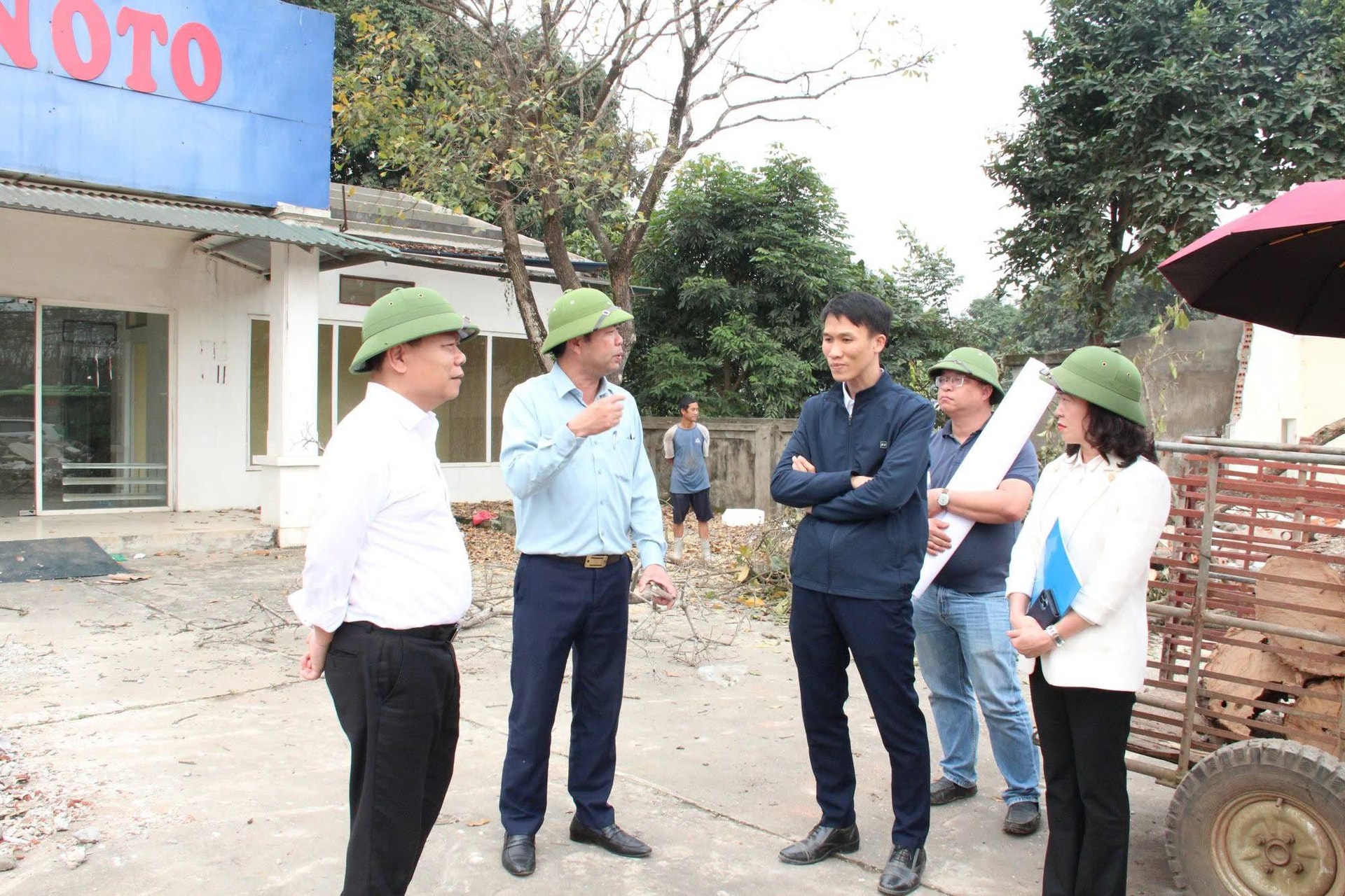 Lãnh đạo xã Hòa Lạc bàn giao mặt bằng thực địa, bảo đảm tiến độ thi công Dự án Đại lộ Thăng Long. Ảnh: Vũ Vân