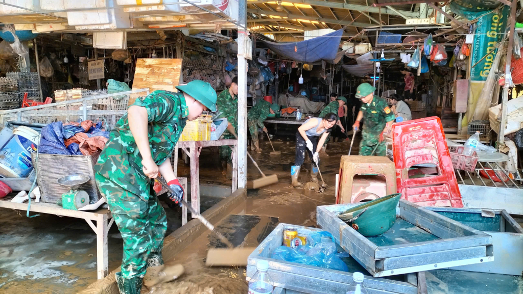 Cán bộ, chiến sĩ bộ đội biên phòng tham gia dọn bùn đất tại Chợ Xanh. Ảnh Huy Dương.