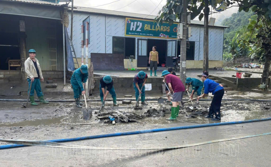 Các lực lượng ra quân dọn dẹp vệ sinh tại các điểm bị ngập lụt, bùn đất, rác thải từ ngã ba Thế giới di động đến cổng chào xóm 2; khu vực chợ nông sản, chợ gia súc xã. UBND xã Bảo Lâm chỉ đạo Phòng Kinh tế và Ban Quản lý dự án xã huy động 2 máy xúc, 2 ô tô, 5 máy bơm cùng nhiều thiết bị khác máy móc, phương tiện, thiết bị từ các đơn vị, doanh nghiệp, Hợp tác xã và nhà thầu thi công trên địa bàn để thu gom, vận chuyển rác thải, bùn đất, tiêu thoát nước tại các khu vực bị ảnh hưởng nặng do mưa bão gây ra.