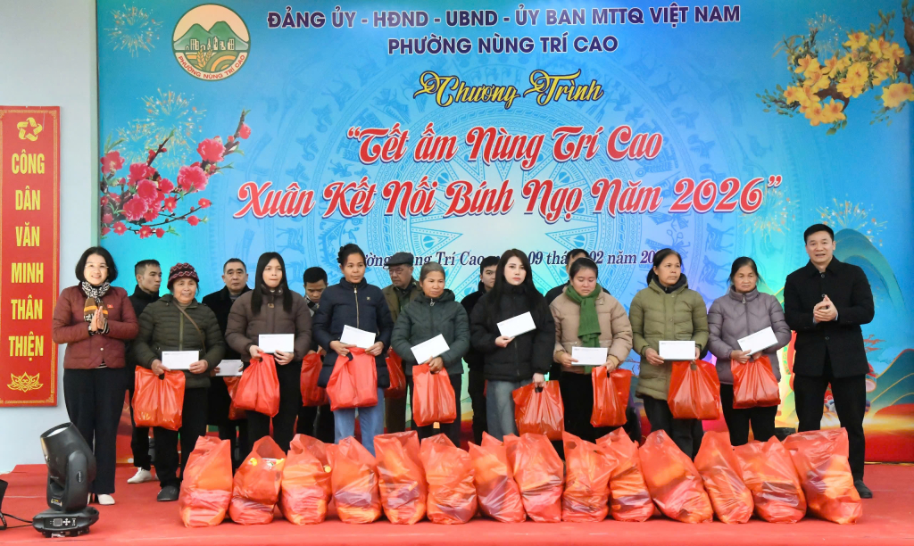 Thực hiện Chương trình “Xuân Nhân ái - Tết yêu thương”, phường Nùng Trí Cao tích cực vận động sự chung tay của các cơ quan, đơn vị, doanh nghiệp, tổ chức, cá nhân trong và ngoài địa bàn, với tổng kinh phí huy động trên 725 triệu đồng. Từ nguồn lực huy động, đến nay, phường trao tặng 1.233 suất quà tết tặng hộ nghèo, hộ cận nghèo, đối tượng bảo trợ xã hội, gia đình chính sách, người có công với cách mạng và các hộ có hoàn cảnh khó khăn. Những phần quà nghĩa tình không chỉ góp phần hỗ trợ vật chất, mà còn là sự động viên kịp thời về tinh thần, giúp các gia đình đón Xuân Bính Ngọ 2026 trong không khí đầm ấm, vui tươi.