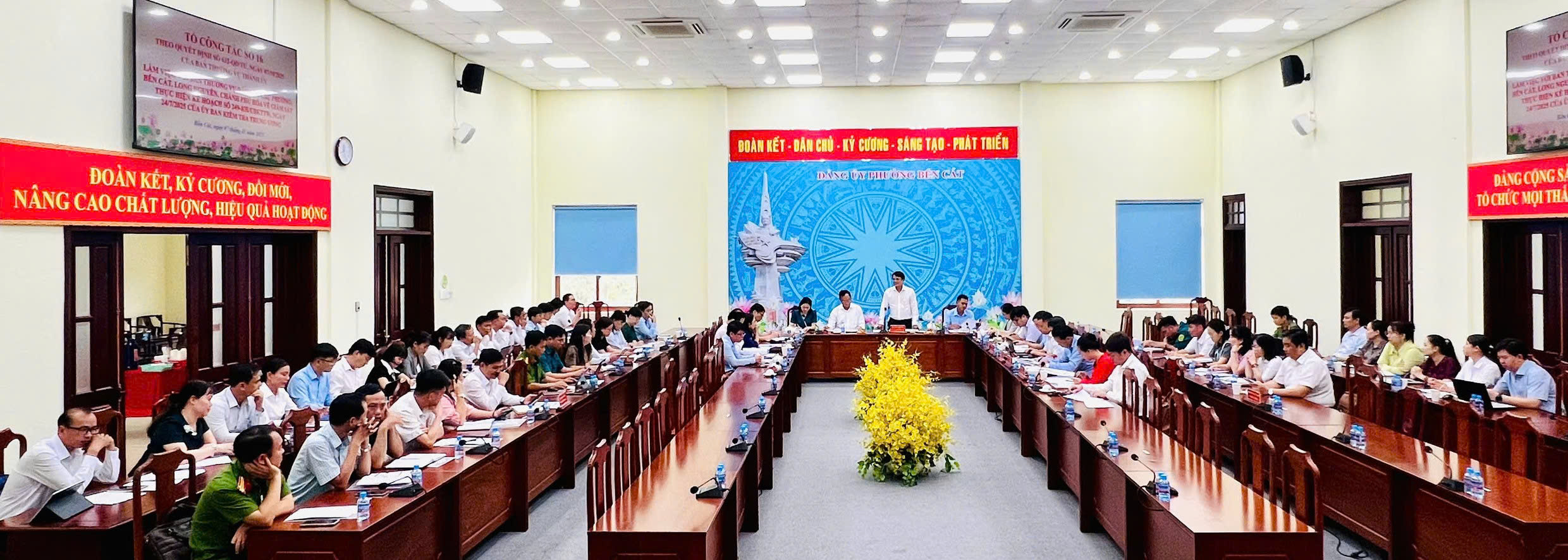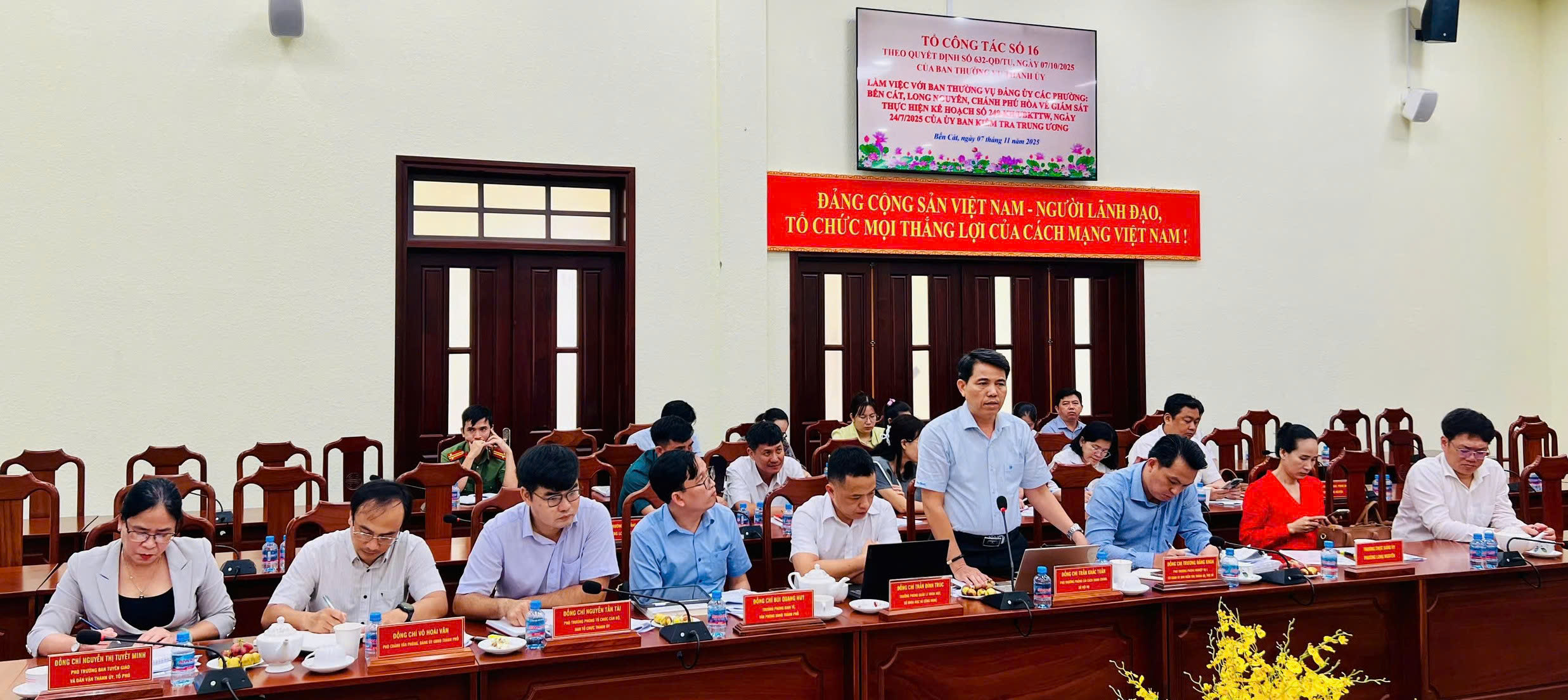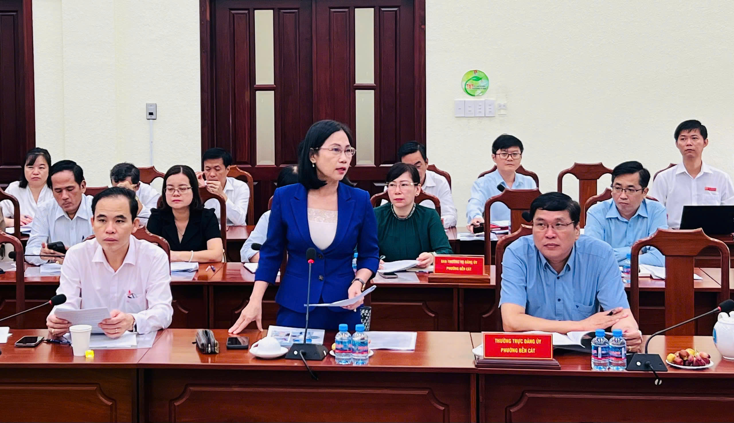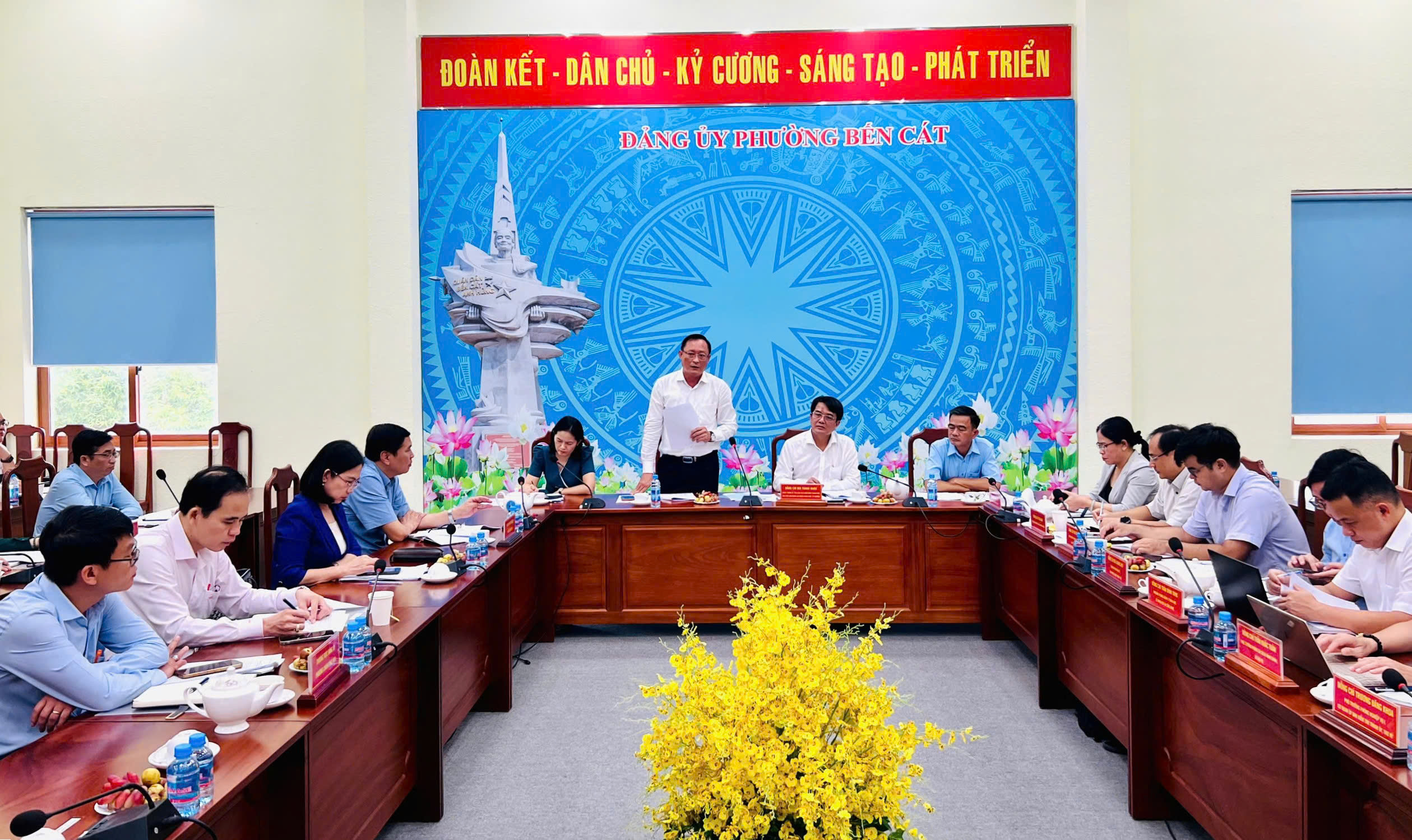 Tại buổi làm việc, các Đảng ủy phường Bến Cát, phường Long Nguyên và phường Chánh Phú Hòa báo cáo tóm tắt kết quả tình hình tổ chức bộ máy sau sắp xếp.