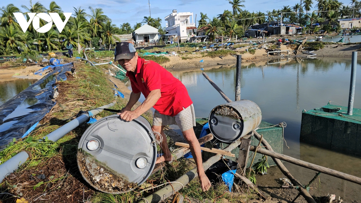 Người dân xã Xuân Cảnh, tỉnh Đắk Lắk sửa sang lại lồng bè sau khi bão đi qua.