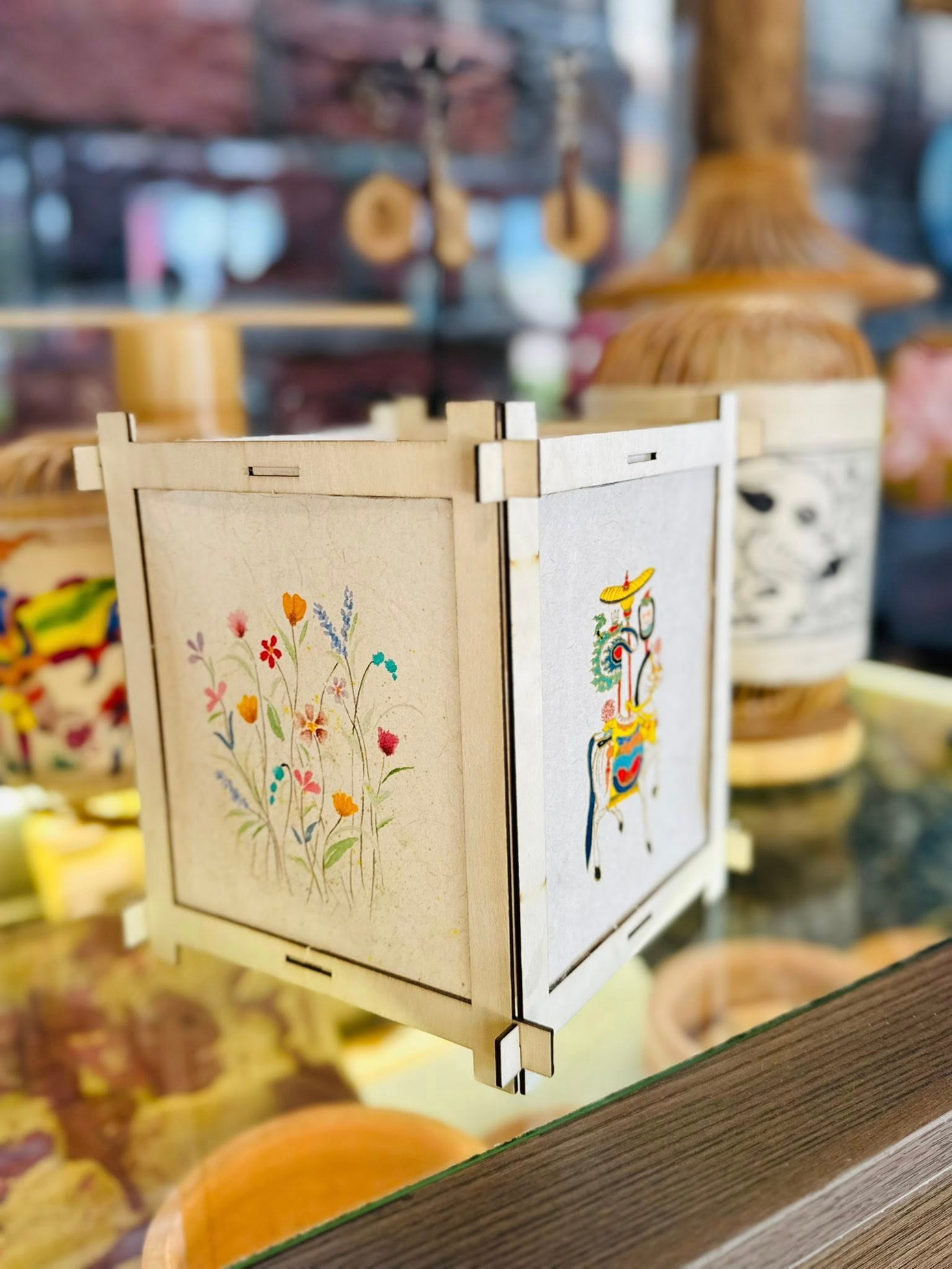 Không gian bên trong đình được trưng bày và sắp đặt hơn 40 chiếc lồng đèn cổ, gồm nhiều hình mẫu như: rồng, châu chấu, bọ ngựa, cá chép,.. Mỗi chiếc đèn, mỗi dáng hình con vật đều được các nghệ nhân tỉ mỉ phục dựng, bên trong đó đều gói gọn một câu chuyện riêng, những nét đẹp văn hóa xưa.