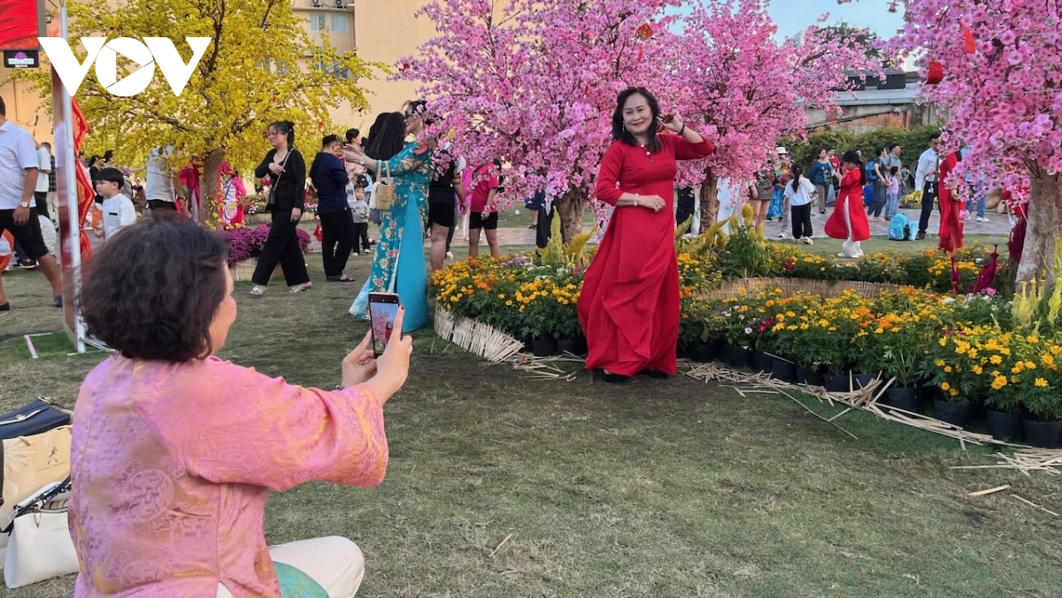 Cùng trong tâm trạng hân hoan, phấn khởi, bà Tân Tiến Quỳnh (ngụ phường Linh Xuân, thuộc TP Thủ Đức trước đây) cùng các chị em trong gia đình mặc áo dài cổ truyền đến đường hoa để chụp hình.