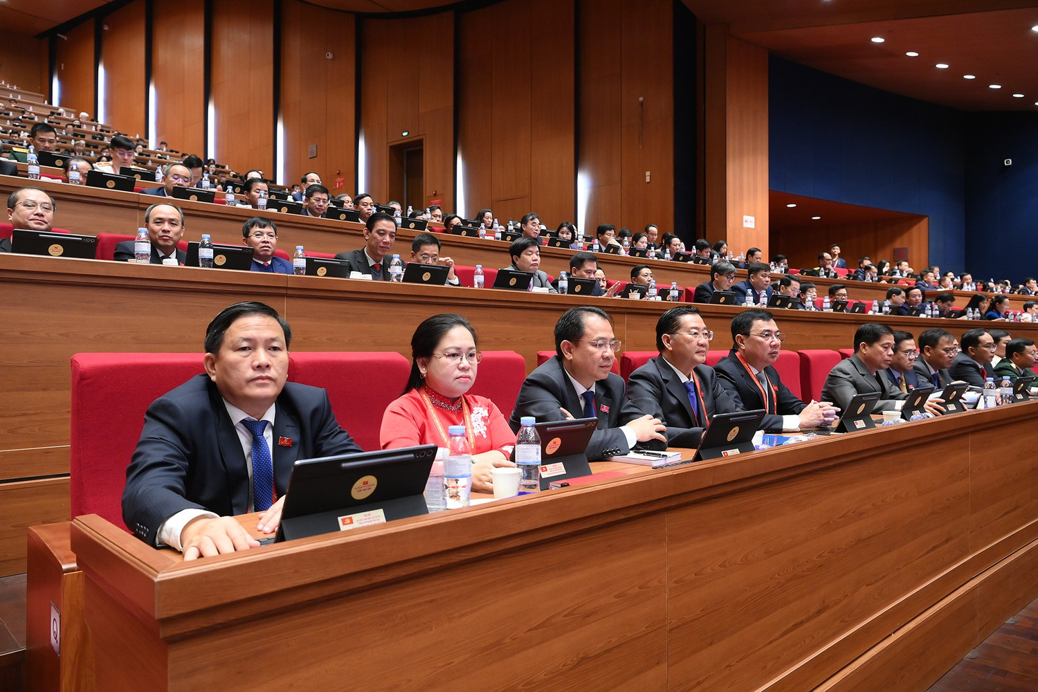 Các đại biểu đoàn Thái Nguyên tại phiên thảo luận ở hội trường về các Văn kiện Đại hội.