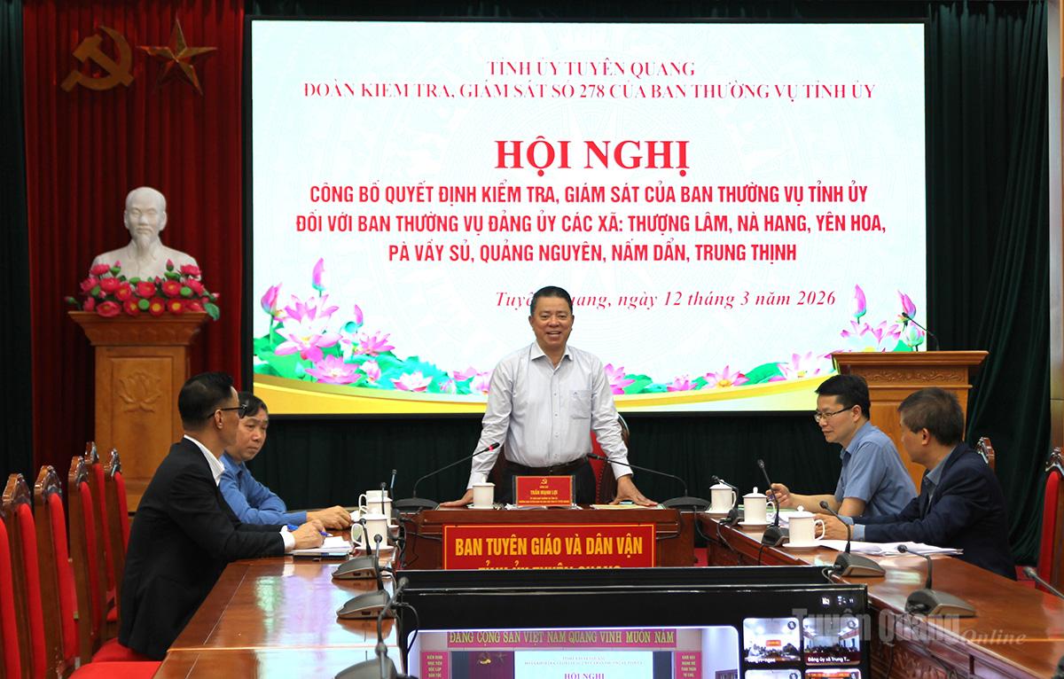 Chiều 12 – 3, Đoàn Kiểm tra, giám sát theo Quyết định số 278 của Ban Thường vụ Tỉnh ủy đã tổ chức hội nghị công bố quyết định kiểm tra, giám sát của Ban Thường vụ Tỉnh ủy đối với Ban Thường vụ Đảng ủy các xã: Thượng Lâm, Nà Hang, Yên Hoa, Pà Vầy Sủ, Quảng Nguyên, Nấm Dẩn, Trung Thịnh. Dự và chỉ đạo hội nghị có đồng chí Trần Mạnh Lợi, Ủy viên Ban Thường vụ Tỉnh ủy, Trưởng ban Tuyên giáo và Dân vận Tỉnh ủy, Trưởng đoàn Kiểm tra, giám sát. Hội nghị được tổ chức trực tiếp tại điểm cầu Ban Tuyên giáo và Dân vận Tỉnh ủy và trực tuyến tới điểm cầu Đảng ủy các xã.