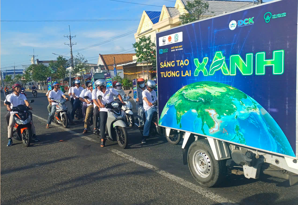 Nhân viên Công ty Điện lực Cà Mau lan tỏa thông điệp “Sáng tạo xanh – Tương lai xanh” hưởng ứng chiến dịch Giờ Trái đất 2026 trên các tuyến phố. (Ảnh: PC Cà Mau)