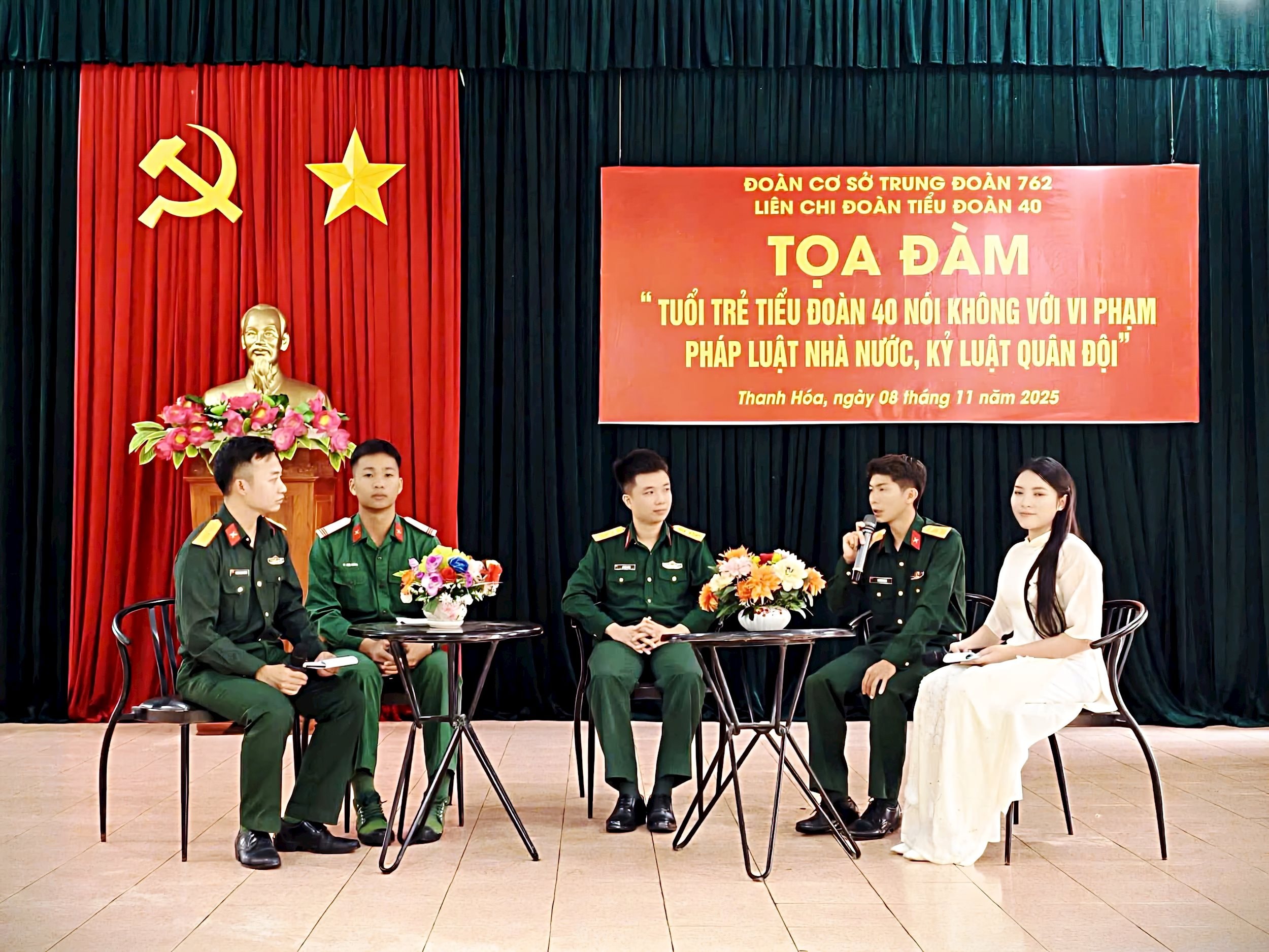 Trong chuỗi hoạt động này, Liên Chi đoàn Tiểu đoàn 40 (thuộc Đoàn cơ sở Trung đoàn 762) tổ chức tọa đàm với chủ đề "Tuổi trẻ Tiểu đoàn 40 nói không với vi phạm pháp luật Nhà nước, kỷ luật Quân đội". Tại buổi tọa đàm, cán bộ, đoàn viên, chiến sĩ đã thẳng thắn trao đổi về những biểu hiện vi phạm kỷ luật thường gặp; phân tích nguyên nhân, hậu quả và đề xuất các giải pháp phòng ngừa. Qua đó, góp phần xây dựng môi trường chính quy, kỷ luật và lan tỏa hình ảnh "Bộ đội Cụ Hồ" trong thời kỳ mới.