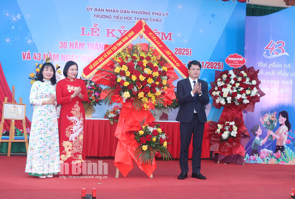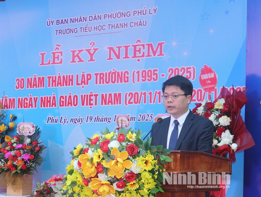 * Sáng 19/11, Trường Tiểu học Thanh Châu (phường Phủ Lý) tổ chức Lễ Kỷ niệm 30 năm thành lập (1995-2025) và 43 năm Ngày Nhà giáo Việt Nam. Đồng chí Ngô Quang Tuệ, Phó Giám đốc Sở Giáo dục và Đào tạo đến dự và chúc mừng nhà trường. Cùng dự có đại diện lãnh đạo phường Phủ Lý và đông đảo các thế hệ cán bộ, giáo viên, học sinh của nhà trường.
