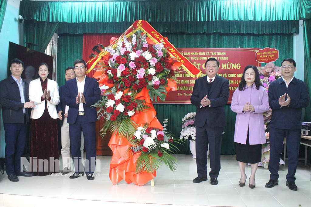 Đồng chí Phạm Hùng Thắng, Tỉnh ủy viên, Phó Trưởng Đoàn đại biểu Quốc hội tỉnh tặng hoa chúc mừng các thầy, cô giáo Trường THCS Đinh Công Tráng (xã Tân Thanh). Ảnh: Chu Bình