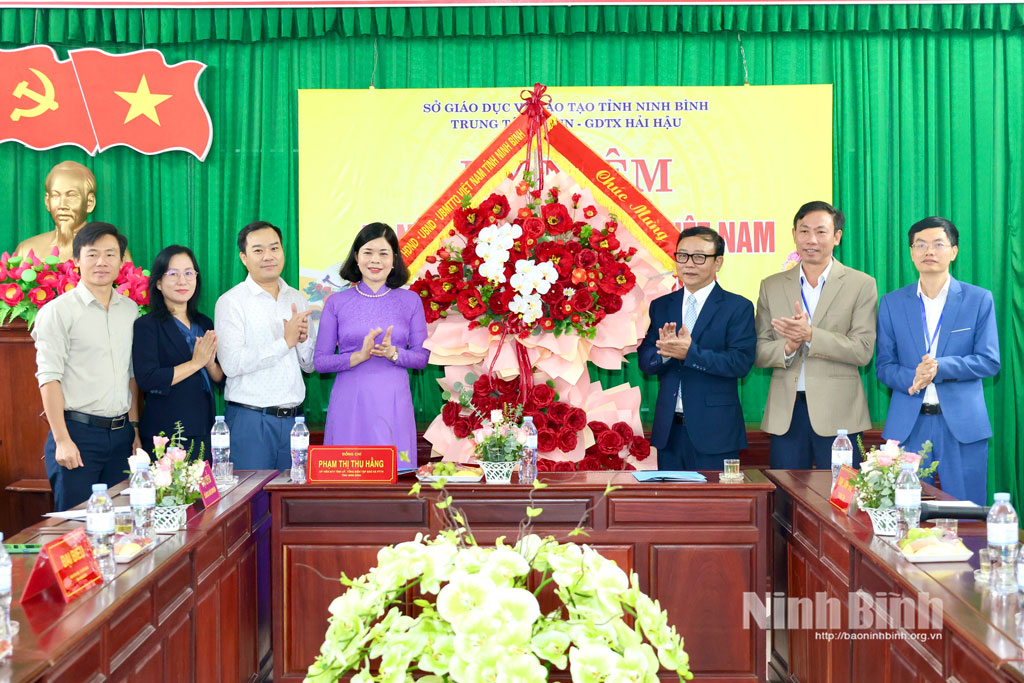 Đồng chí Phạm Thị Thu Hằng, Ủy viên BTV Tỉnh ủy, Tổng Biên tập Báo và phát thanh, truyền hình Ninh Bình tặng hoa chúc mừng thầy, cô giáo Trung tâm GDNN - GDTX Hải Hậu, xã Hải Hưng nhân kỷ niệm 43 năm Ngày Nhà giáo Việt Nam.