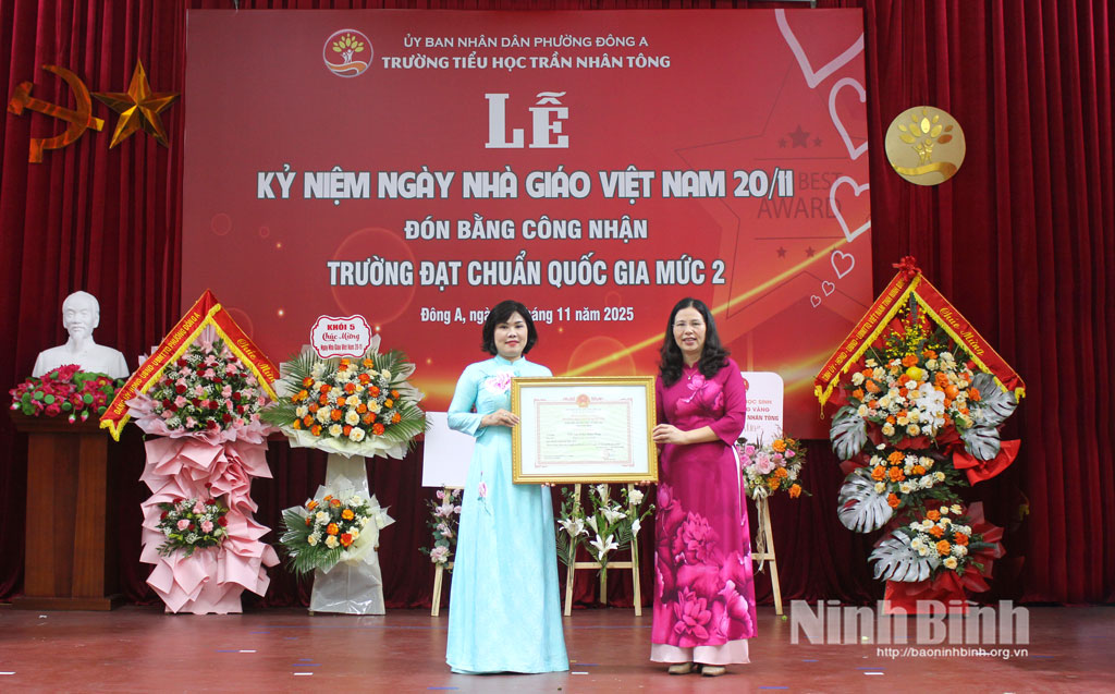 Lãnh đạo UBND phường Đông A trao Bằng công nhận trường đạt chuẩn quốc gia mức độ II cho tập thể Trường Tiểu học Trần Nhân Tông.