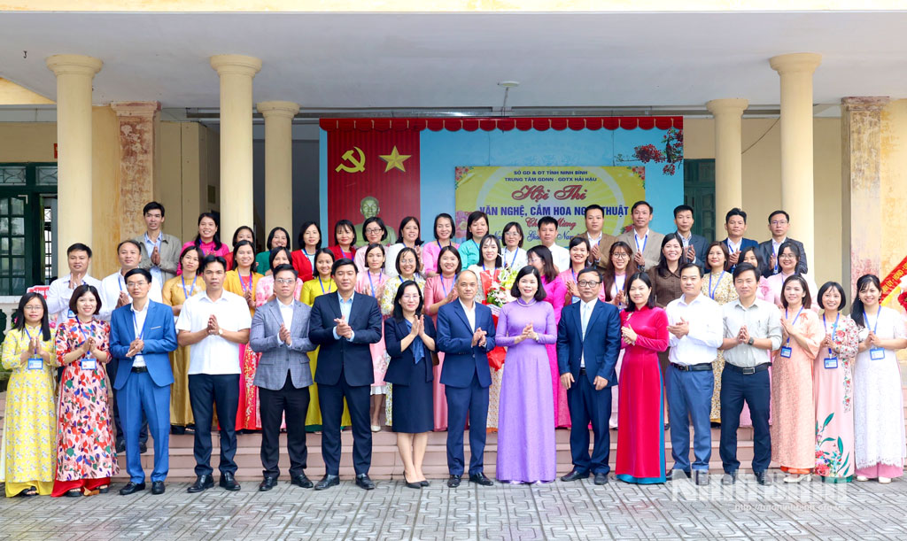 Đồng chí Phạm Thị Thu Hằng, Ủy viên BTV Tỉnh ủy, Tổng Biên tập Báo và phát thanh, truyền hình Ninh Bình và lãnh đạo xã Hải Hưng chụp ảnh lưu niệm cùng thầy, cô giáo và người lao động Trung tâm GDNN - GDTX Hải Hậu.