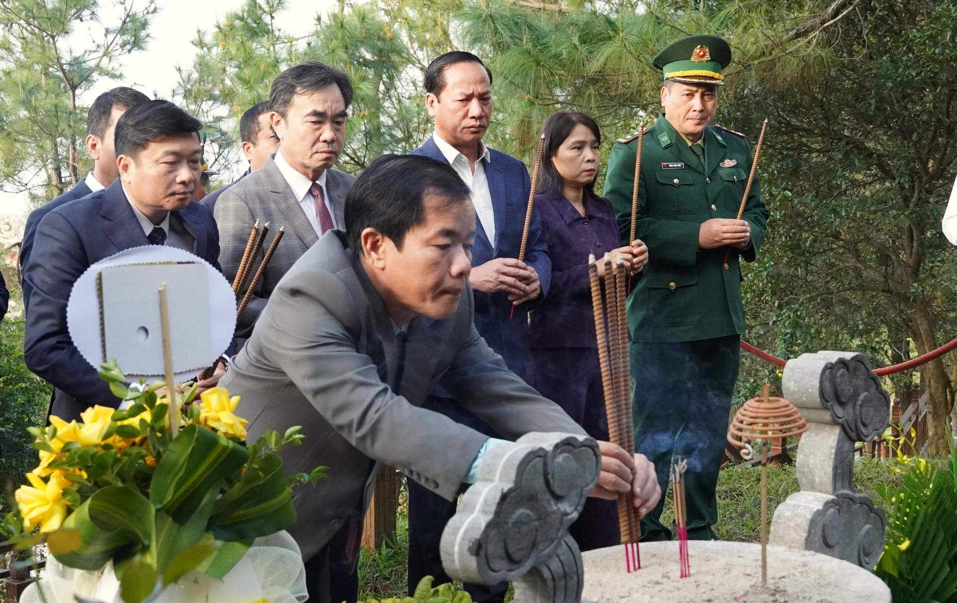 Các đồng chí lãnh đạo tỉnh dâng hương lên phần mộ Đại tướng Võ Nguyên Giáp - Ảnh: Q.V