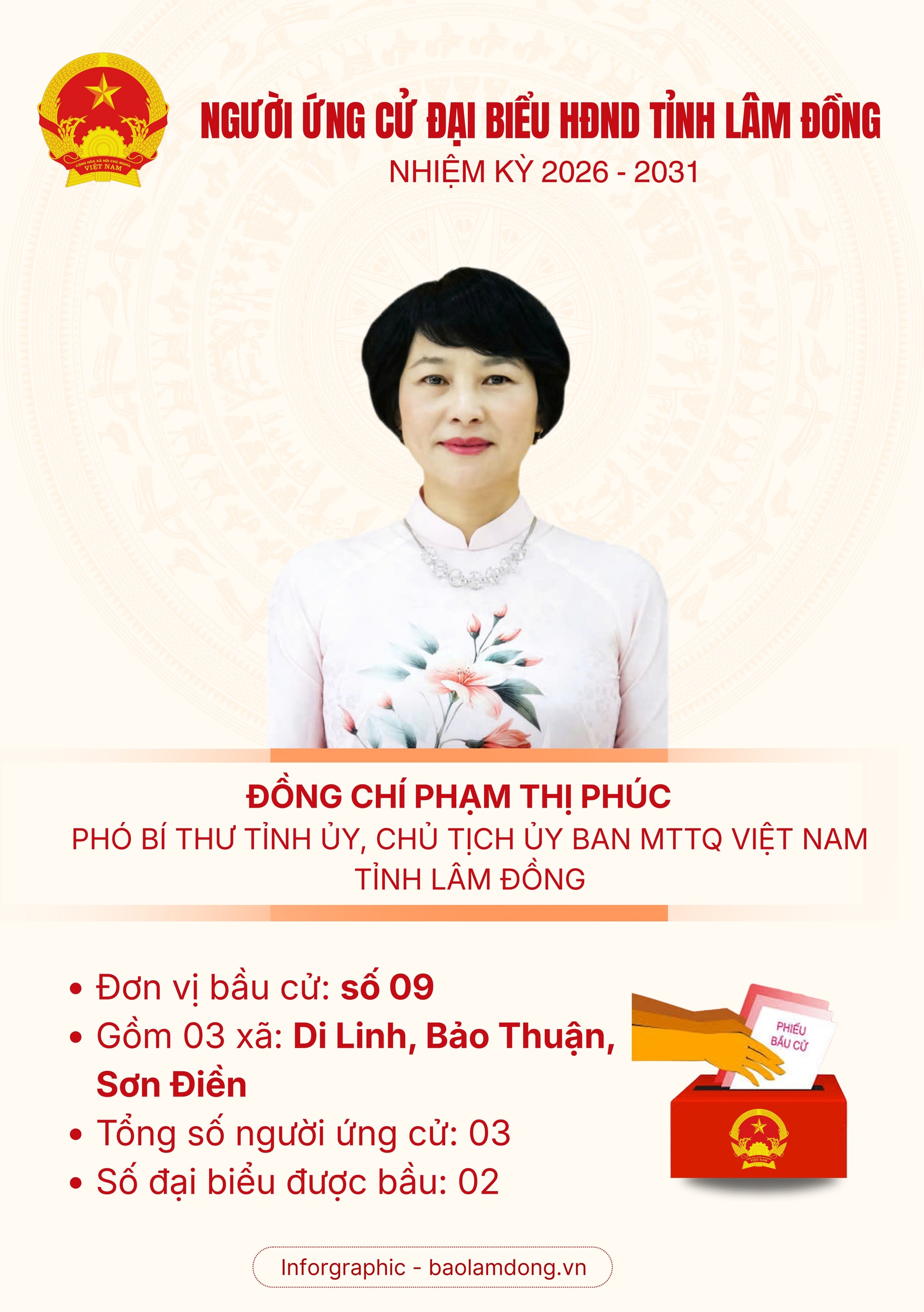 Xem chi tiết Danh sách những người ứng cử đại biểu HĐND tỉnh Lâm Đồng nhiệm kỳ 2026 - 2031 ở Đơn vị bầu cử số 09 tại đây.