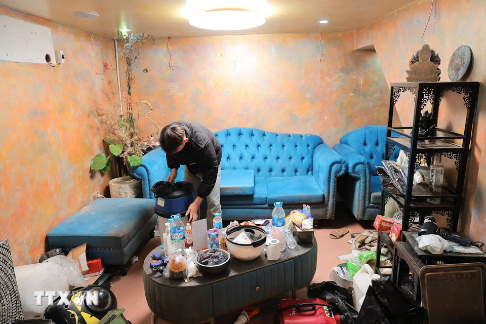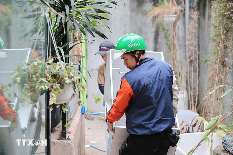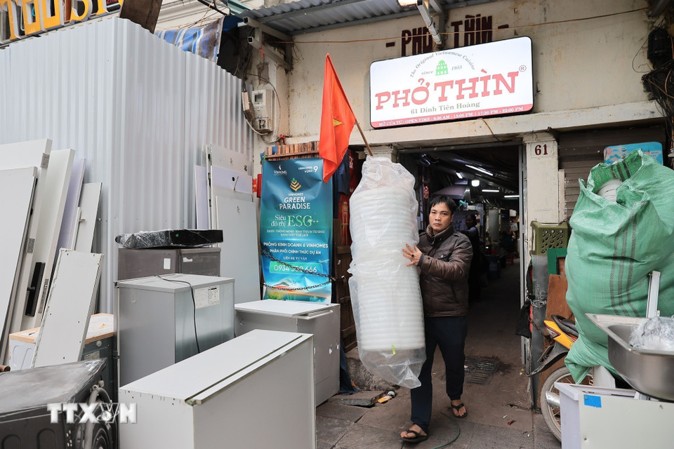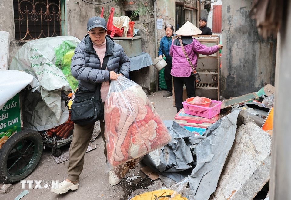 Người dân sinh sống trên phố Đinh Tiên Hoàng, phường Hoàn Kiếm thu dọn đồ đạc, vật dụng để bàn giao mặt bằng theo kế hoạch. (Ảnh: Lê Đông/TTXVN)