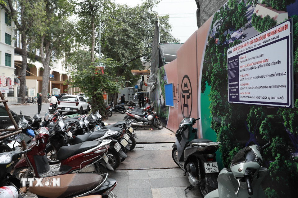 Bên ngoài Dự án đầu tư xây dựng phân kỳ 1 - Quảng trường, công viên phía Đông hồ Hoàn Kiếm đã được quây tôn. (Ảnh: Lê Đông/TTXVN)