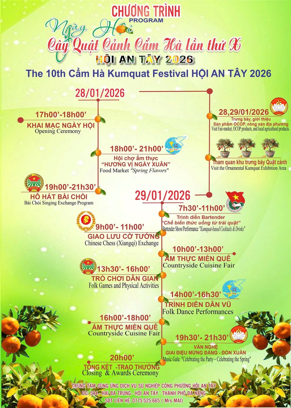 Phường Hội An Tây cũng sẽ tổ chức ngày hội cây quật cảnh Cẩm Hà lần thứ 10-năm 2026 trong hai ngày 28-29.1 (nhằm ngày 10,11 tháng Chạp Âm lịch) tại khu vực bờ hồ Trảng Kèo với nhiều hoạt động đặc sắc như: Trưng bày, giới thiệu, tôn vinh nghề trồng quật (cây quất) cảnh và các sản phẩm hoa cây cảnh đặc trưng, các sản phẩm OCOP, nông sản địa phương; hội chợ ẩm thực Hương vị ngày xuân, ẩm thực miền quê, hội hô hát bài chòi, trình diễn dân vũ, trình diễn bartender, chế biến thức uống từ nước quật,…