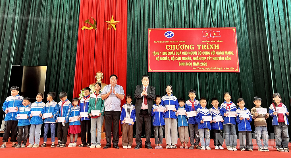 * Nhân dịp Tết Nguyên đán Bính Ngọ 2026, chiều 29/1, Tập đoàn Kinh tế Xuân Thành phối hợp với phường Yên Thắng tổ chức chương trình tặng quà Tết cho người có công với cách mạng, hộ nghèo, cận nghèo trên địa bàn phường.