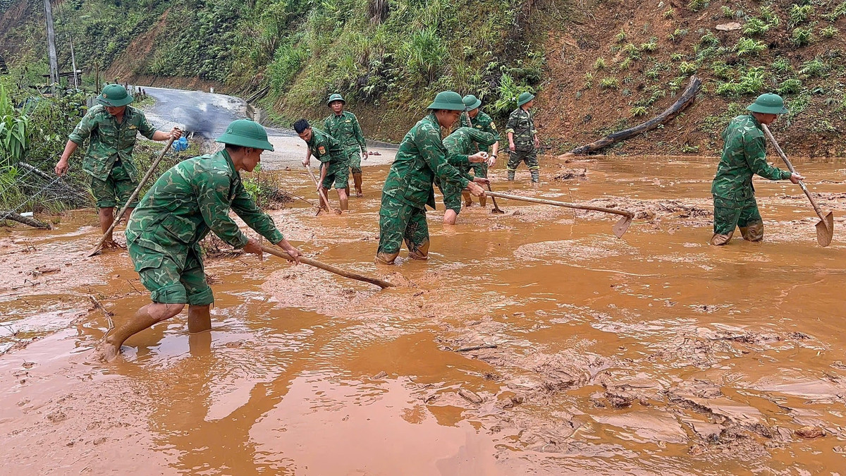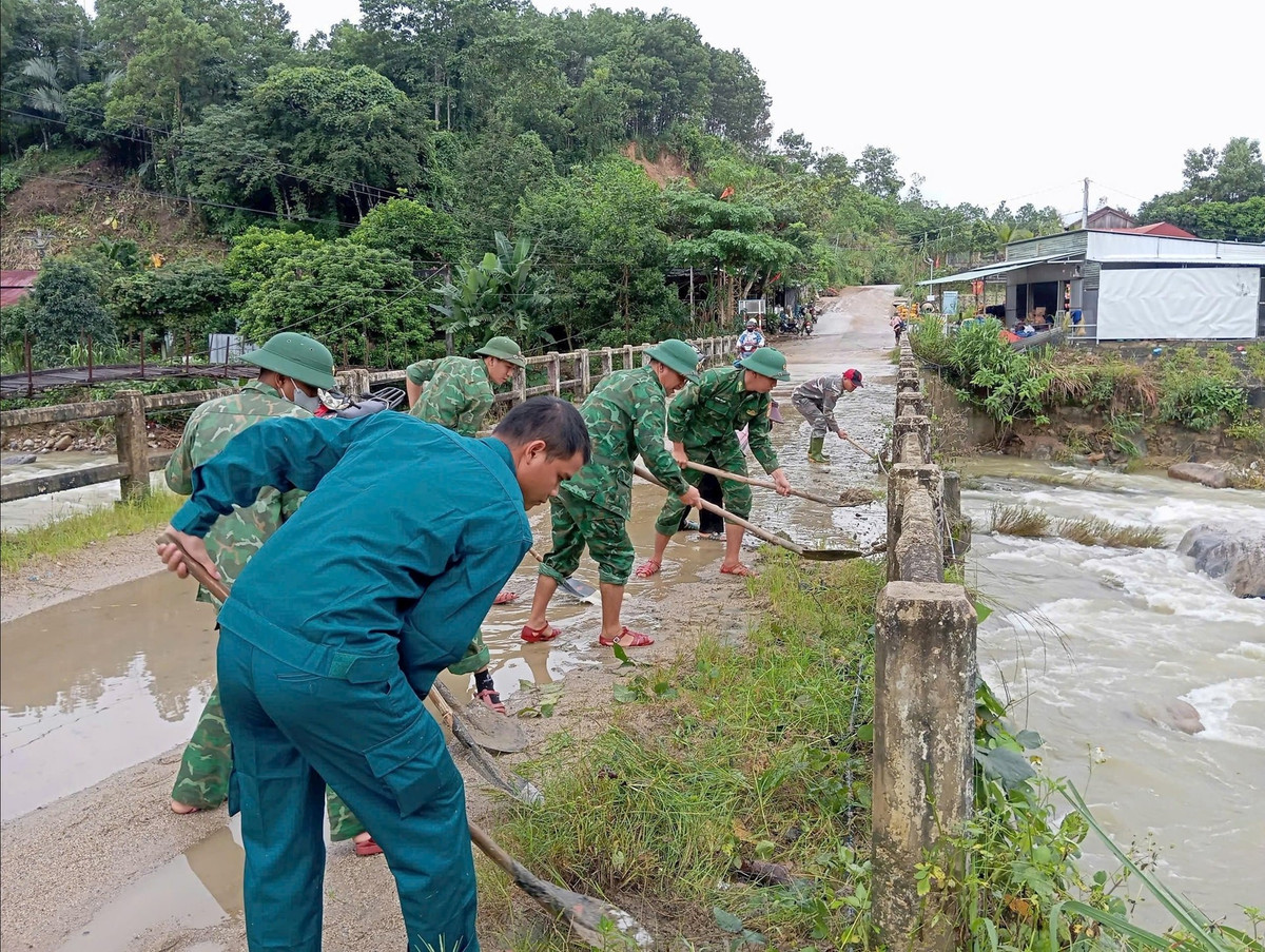 Tại các xã vùng cao như Hùng Sơn, La Dêê, Đắc Pring cán bộ, chiến sĩ các đồn biên phòng đã có mặt từ sớm để cùng chính quyền địa phương tổ chức dọn dẹp đất đá, khơi thông đường sá, thu gom bùn đất trong khu dân cư, di dời tài sản của các hộ bị sạt lở.