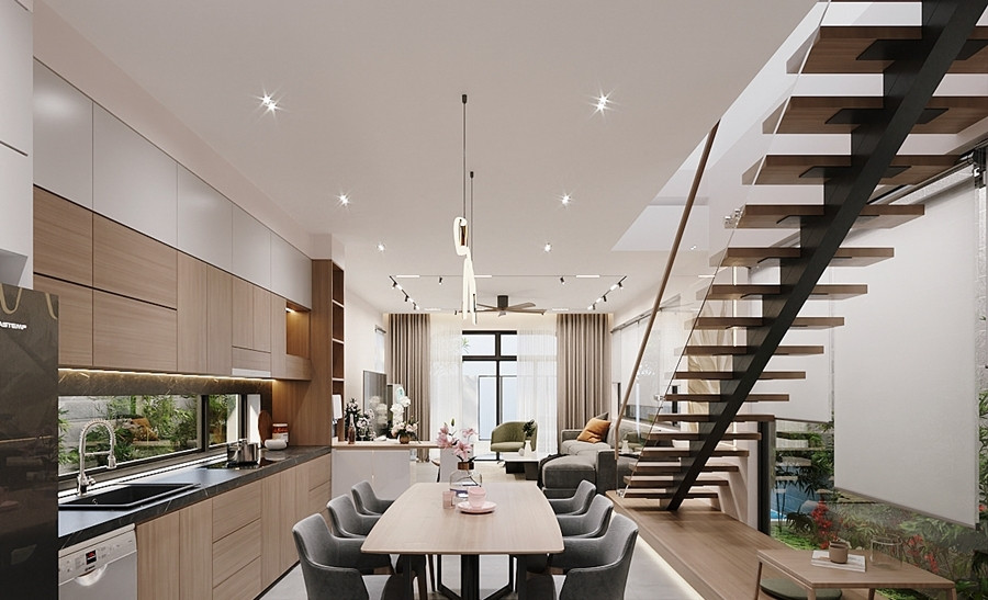 Ngoài ra, cầu thang xương cá giúp không gian trở nên thông thoáng hơn nhờ kết cấu gọn gàng, đặc biệt phù hợp với nhà ống, nhà phố có mặt tiền hẹp. Khi nhìn từ xa, cầu thang xương cá không gây cảm giác nặng nề, bí bách như các mẫu cầu thang xây kín truyền thống.