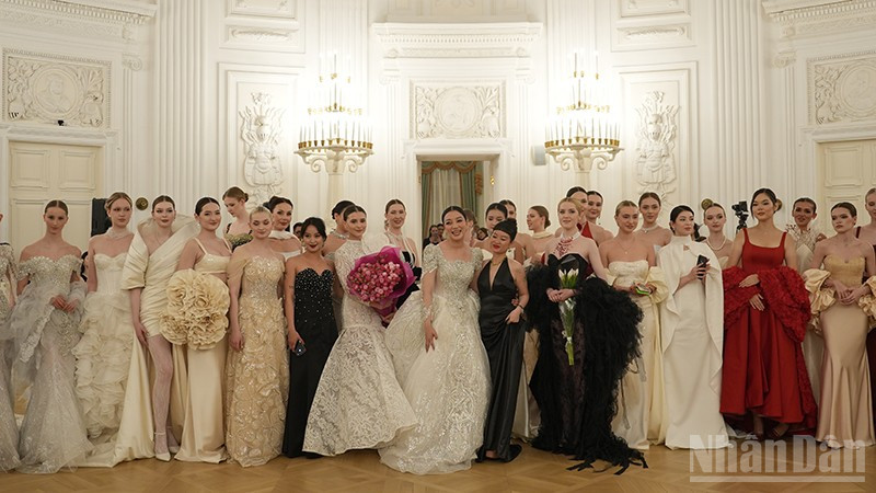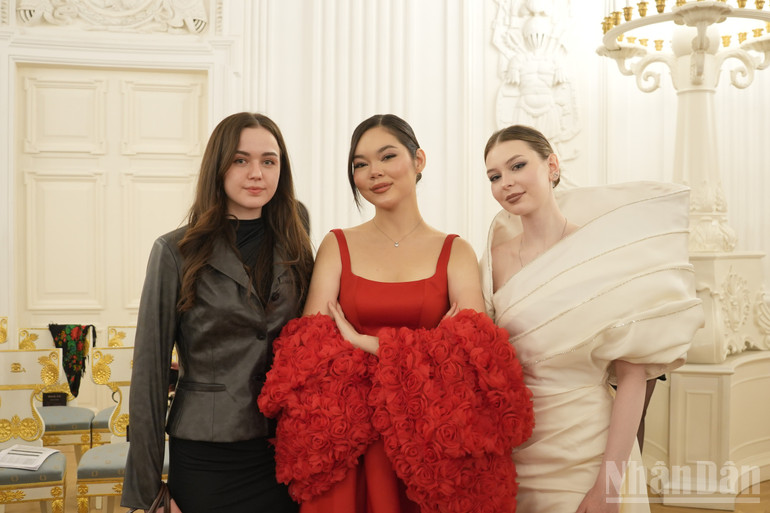 Nhà thiết kế Nguyễn Thùy Linh (áo đen, ở giữa) cùng với các thiết kế lấy cảm hứng từ kiến trúc và không gian hoàng gia của Cung điện Petrovsky. (Ảnh: XUÂN HƯNG)
