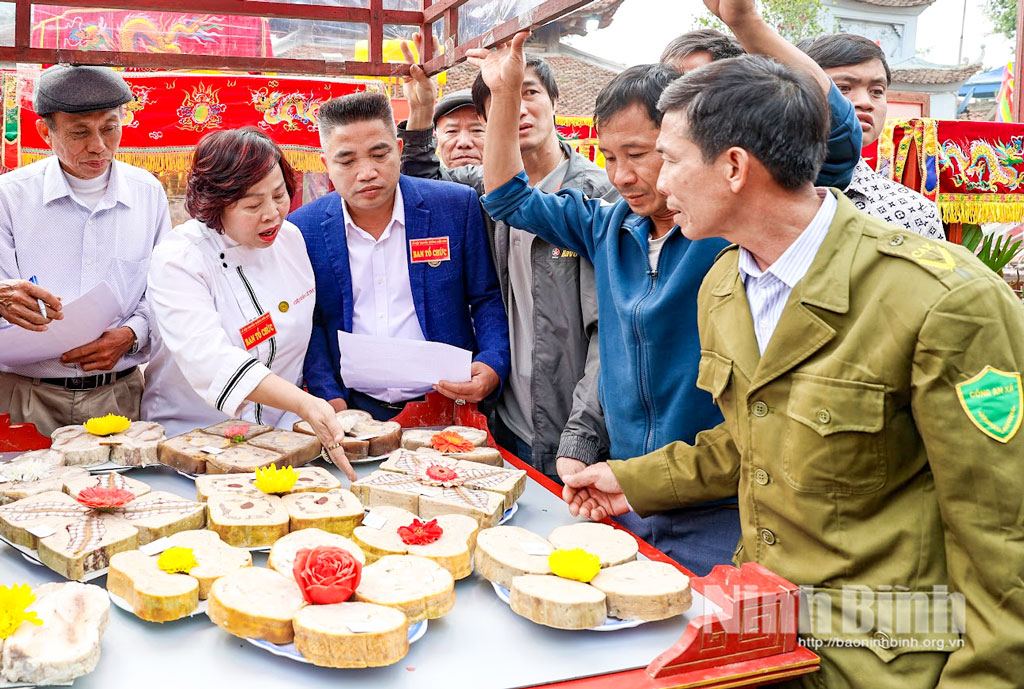 Ban tổ chức chấm điểm các kiệu cỗ.