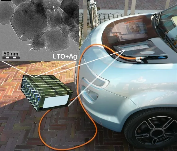 Hình ảnh mô phỏng hệ thống pin lithium-ion kết nối với xe điện, sử dụng vật liệu nano LTO+Ag để tăng tốc độ phản ứng và cải thiện hiệu suất sạc. (Nguồn: MIT)