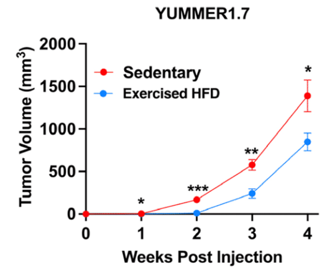 Một kết quả khác từ nghiên cứu cho thấy những con chuột béo phì được tập luyện hai tuần trước khi cấy tế bào ung thư cũng có khối u nhỏ hơn so với nhóm không vận động, cho thấy lợi ích phòng ngừa ngay cả khi luyện tập diễn ra trước khi khối u hình thành.