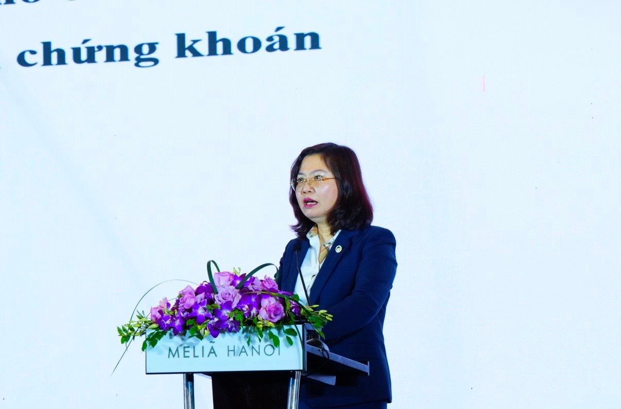 Chủ tịch Ủy ban Chứng khoán Nhà nước Vũ Thị Chân Phương nêu các giải pháp phát triển thị trường chứng khoán. Ảnh: M.T