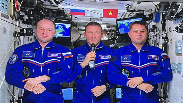 “Từ ISS, chúng tôi, Sergei Kutsverchkov, Sergei Mikayev và Andrei Fedyaev, xin gửi đến quý vị ở Hà Nội, thủ đô nước Việt Nam, lời chào nồng nhiệt nhất”, các phi hành gia nói từ ISS. Phía trên họ là hai lá cờ Việt Nam và Liên bang Nga.