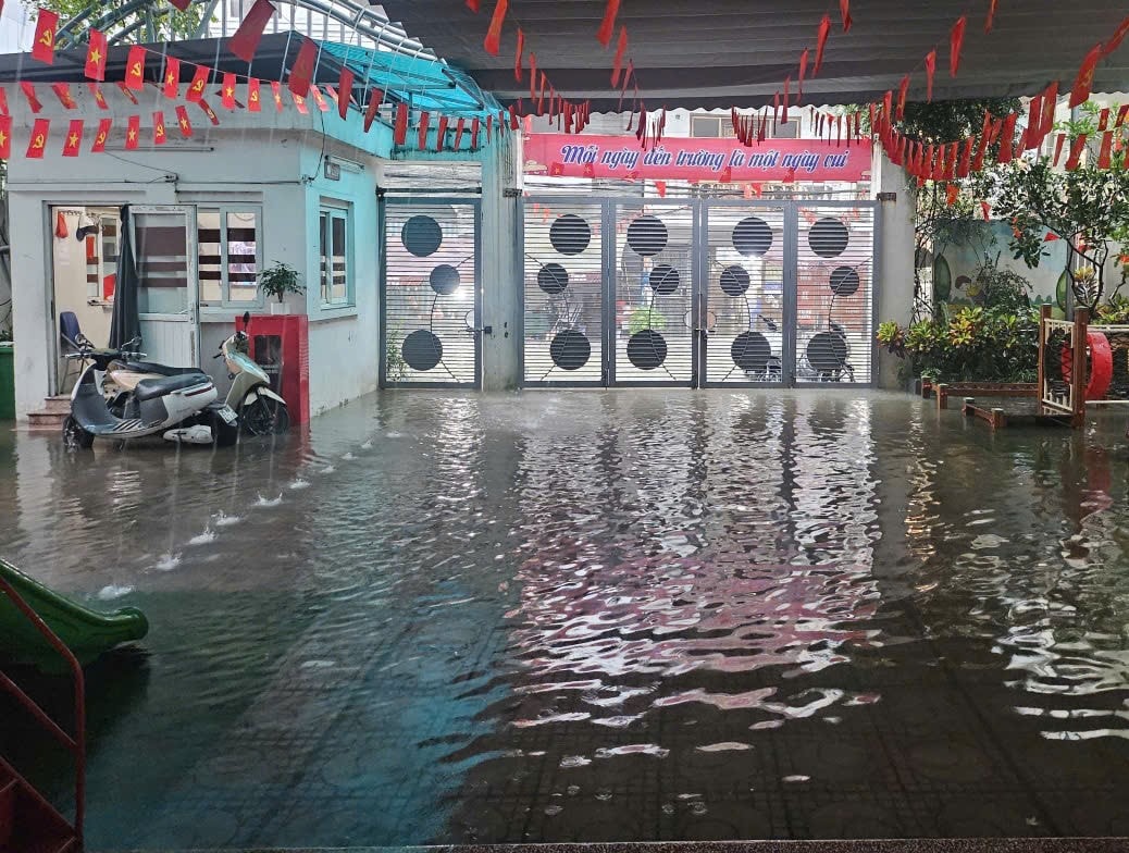 Hiệu trưởng Trường Mẫu giáo số 10 Lê Thị Trâm Anh (phường Ba Đình) cho biết, do ảnh hưởng mưa lớn, từ 12h ngày 30-9, quãng đường trước cổng trường ngập sâu 1m, sân trường ngập sâu 60cm và các phòng, lớp ở tầng 1 ngập sâu 20-30cm, hành lang và các phòng học, phòng làm việc ở các tầng 2, 3, 4 cũng bị nước tràn vào từ ban công.