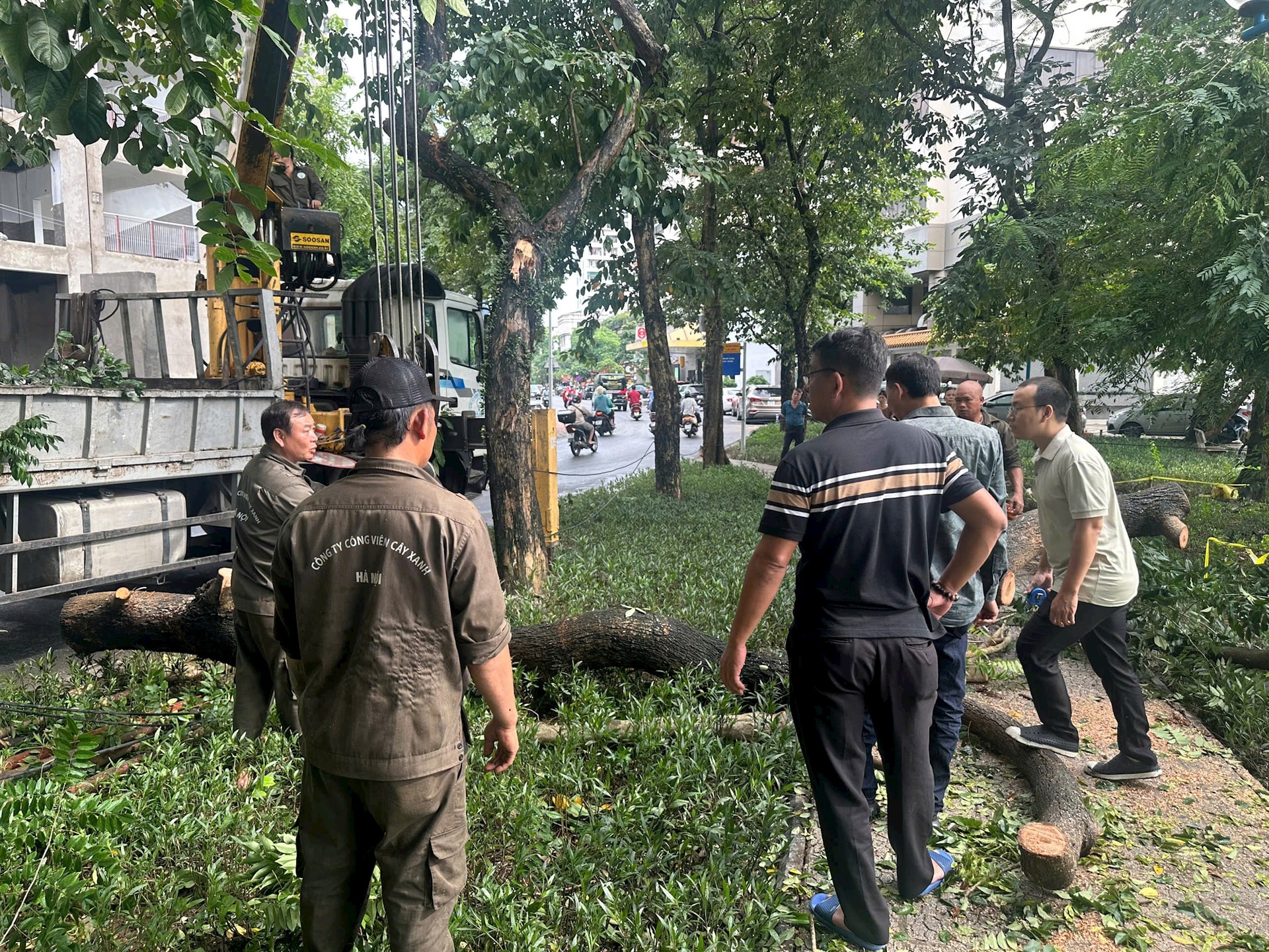 Phường Giảng Võ xử lý cây xanh đổ sau bão tại vườn hoa. Ảnh: HN