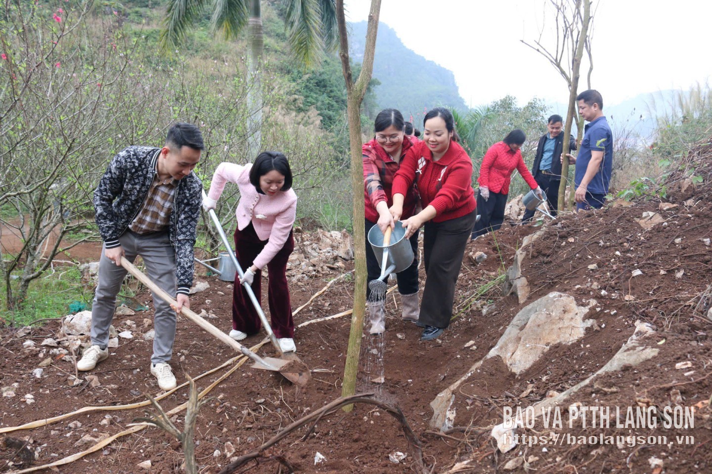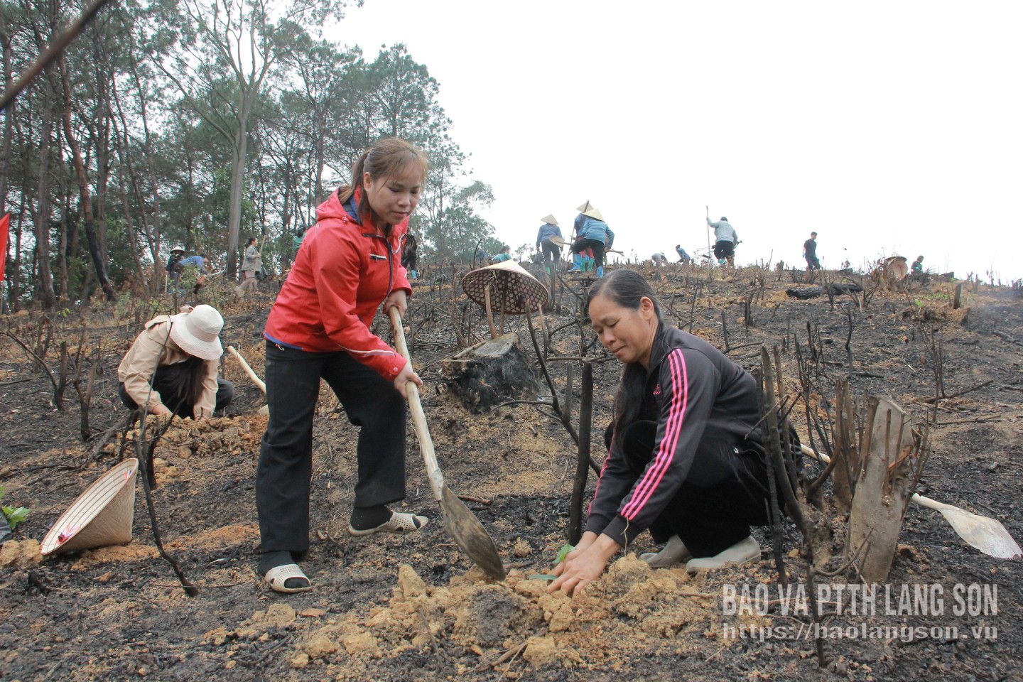 Các lực lượng tham gia hỗ trợ gia đình ông Lộc Văn Lắp trồng cây keo