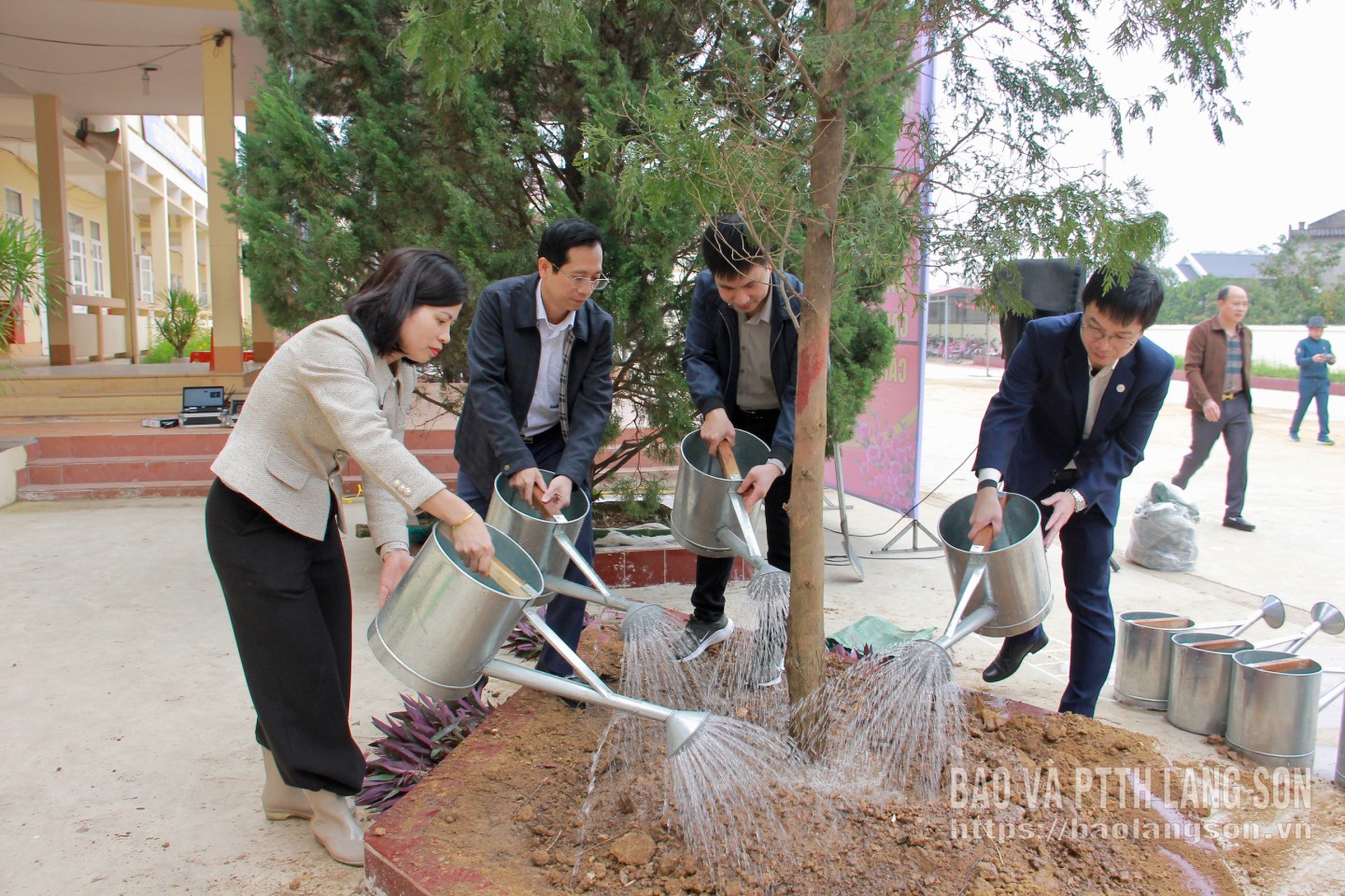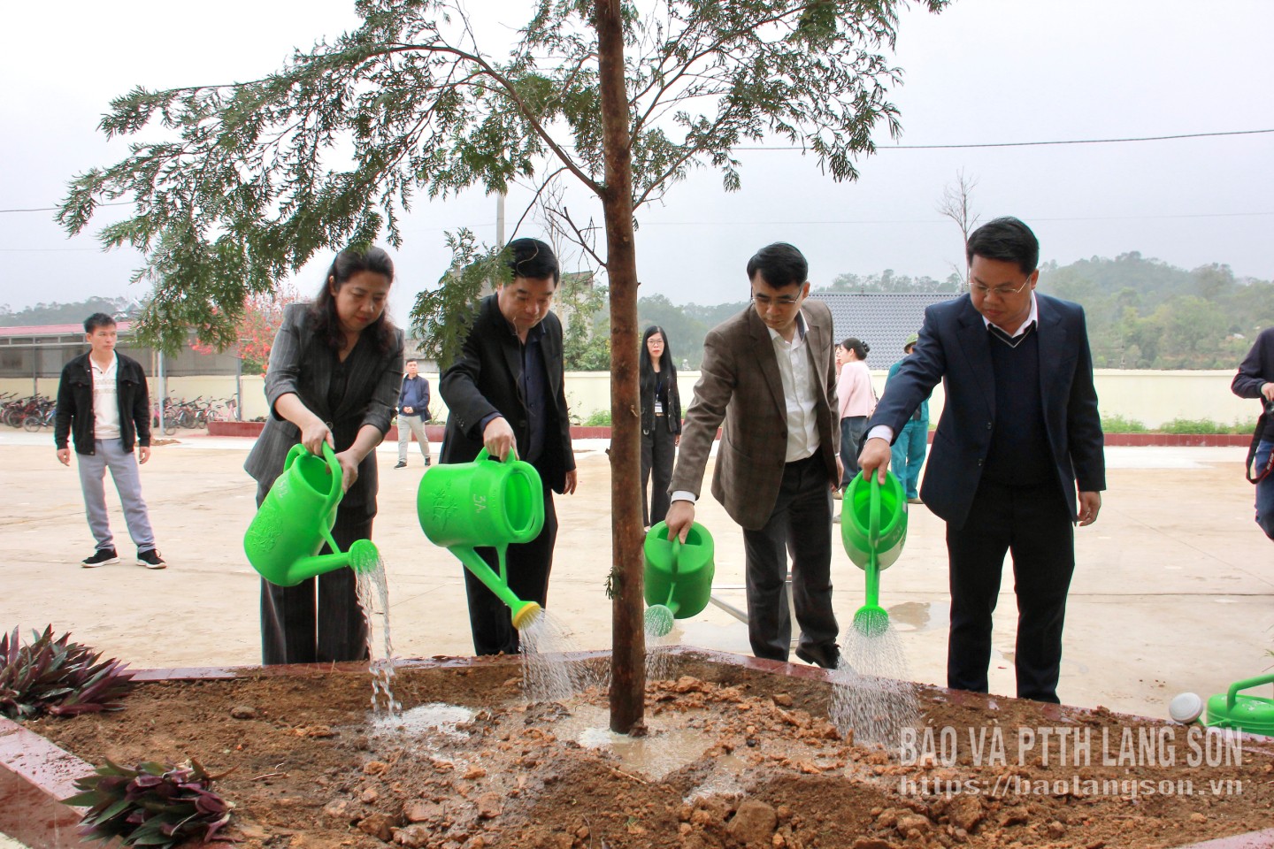 Lãnh đạo các sở, ban, ngành và UBND phường Kỳ Lừa trồng cây tại Trường Tiểu học Tân Liên