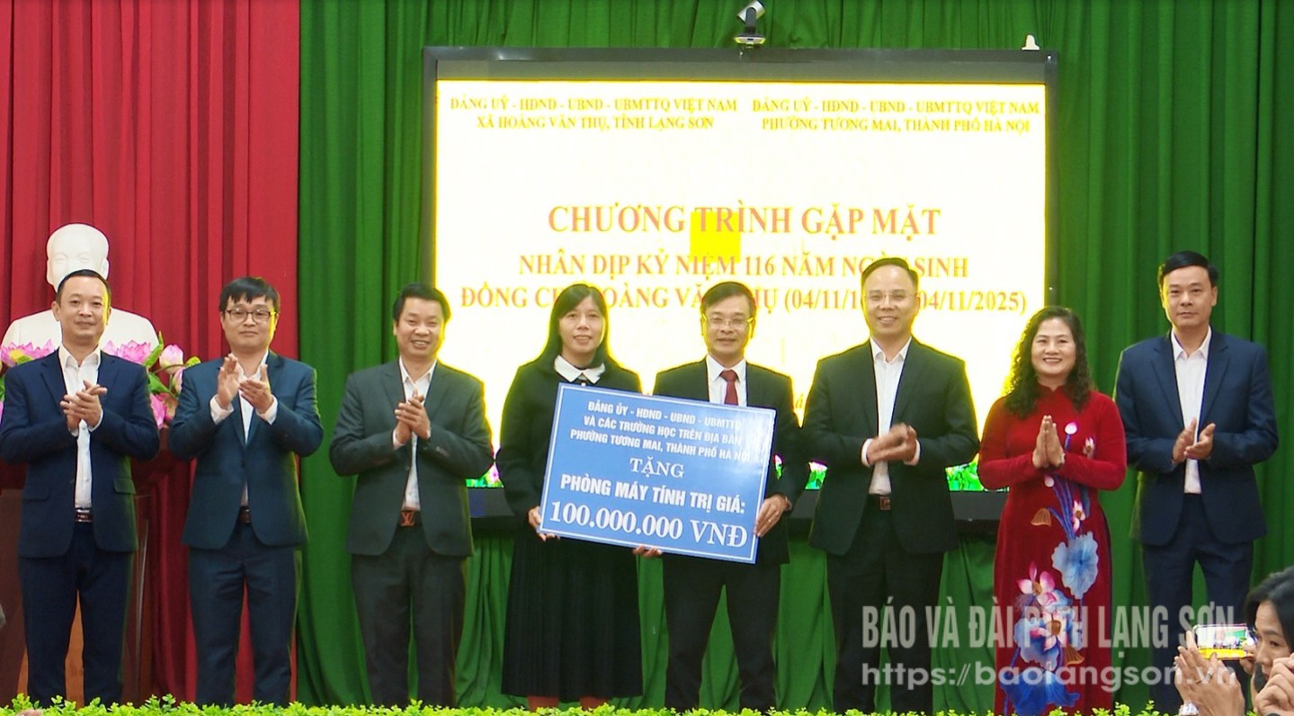Đoàn đại biểu phường Tương Mai trao tặng xã Hoàng Văn Thụ kinh phí xây dựng phòng máy tính