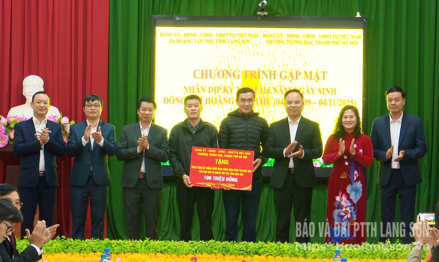 Đoàn đại biểu phường Tương Mai trao tặng xã Hoàng Văn Thụ kinh phí xây dựng công trình hệ thống chiếu sáng công cộng