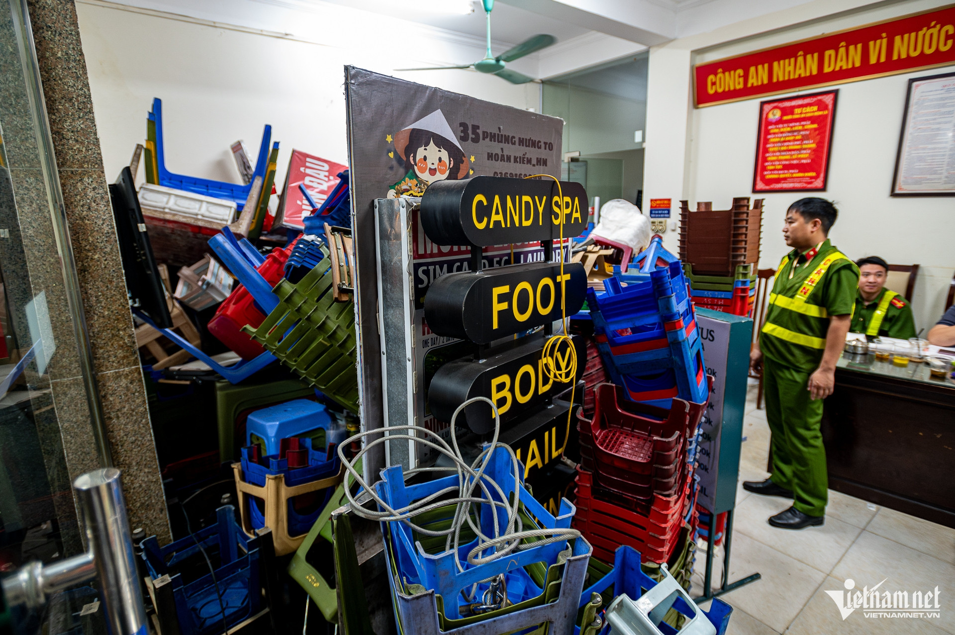 Sau thời gian tăng cường xử lý vi phạm, trụ sở Công an phường Hoàn Kiếm chật kín bàn ghế và các vật dụng bị thu giữ.
